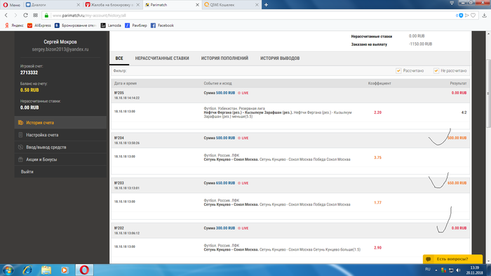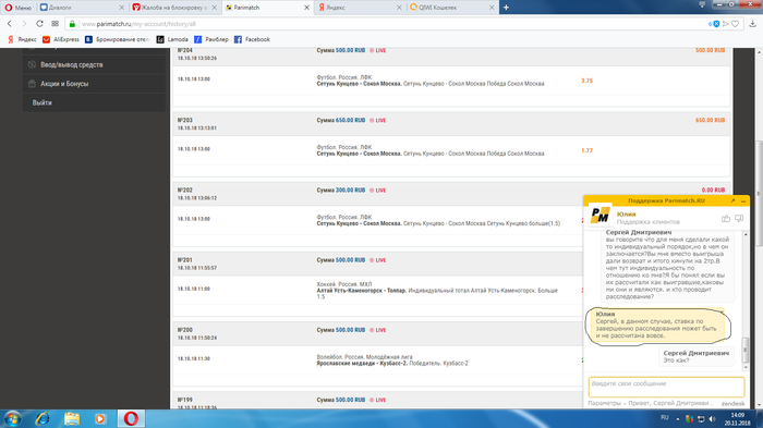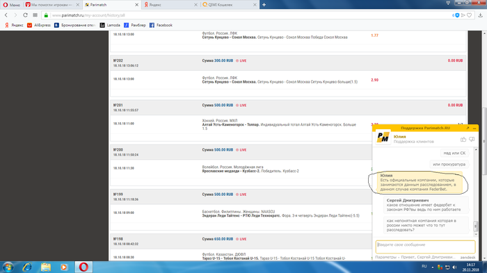 Привет.Начало данной истории здесь legalbet.ru/complaint/14211/#comment2014131 и теперь продолжение.Значит контора приняла у меня как вы знаете 3 ставки и 2 ставки которые выиграли рассчитали возвратом,а та которая проиграла оставили в силе, скрин прилагаю.Значит на мой вопрос почему так,они говорят что это какой то подозрительный матч.Дальше еще интереснее,они заявили что в отношения меня это был чуть ли не индивидуальный шаг и они чуть ли не сделали мне одолжение кинув меня на 2тр.Дальше еще интереснее,они говорят что мне повезло и ставки вообще могли быть не рассчитаны и когда они подозревают матчи в договорняке,то есть два варианта или рассчет с кэфом 1 или не рассчет ставок вообще.пхахахаххаха вы прочитайте еще раз.Вы делаете ставку и они могут эту ставку или никогда не рассчитать,НИКОГДА или рассчитать ее с кэфом 1.т е выиграть вы не можете никак.Дальше я спросил у них кто проводит расследование?Ну лицензия у них Российская и мне интересно кто?Прокуратура, СК,МВД Отдел К или может кто еще.Ответ их,что это какой то Федербет.Тут же вопрос,кто это такие и какое они имеют отношение к законам РФ?Федербет ком и они имеют какое отношение к европейским конторам и то косвенное,а тут контора работающая под российскими законами с доменом ру.В общем мне достаточно данных скринов,чтобы обратится в правоохранительные органы РФ,ведь контора зарегана именно тут,а не НАТО и Федербету и попросить разобраться с данной шарагой,которая 1.Рассчитывает ставки в одну сторону.Те кто выиграл получают возврат,те кто проиграл тот проиграл 2.Которая в открытую пишет что рассчитывает ставки или возвратом или не рассчитывает ставки вообще и тем самым подписывает себя под воров и мошенников у которых нельзя выиграть 3.Которая пишет про какие то расследования,которые проводит непонятная организация под названием Федербет,которая работает под доменом ком и не имеет никакого отношения к российским законам.они нет никто и звать их тут никак и пусть наши органы проведут расследование в отношение этих двух ОПГ под названием париматч и федербет Ну и конечно напишу прямо сейчас на Пусть наши власти посмотрят кому они дают лицензию.Компании которая в открытую пишет что есть три варианта,или вы проиграли или вы получаете возврат или ваша ставка вообще никогда не будет рассчитана.