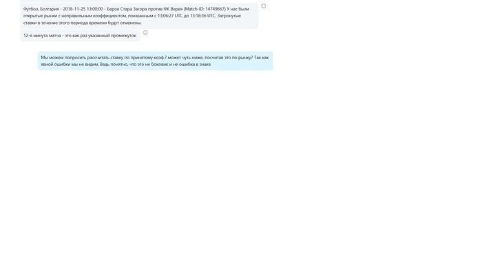 Делал ставку на матч футбол Берое Стара-Загора - Верея в лайве на 12 минуте матча при счете 0-0 1 тайм тотал больше 1 гола за коф номер ставки 588234438. Сыграли 2-0 мне дали возврат, в поддержки пишут что неверный коэффициент, хотя до начала матча больше 1 было 1.6, после того как сыграли 12 минут матча и не забили гола вполне нормальный коф. Можете посмотреть в лайве данной БК другие матчи при 0-0 на 10-15 минуте всегда дают коф больше 2.0!!!