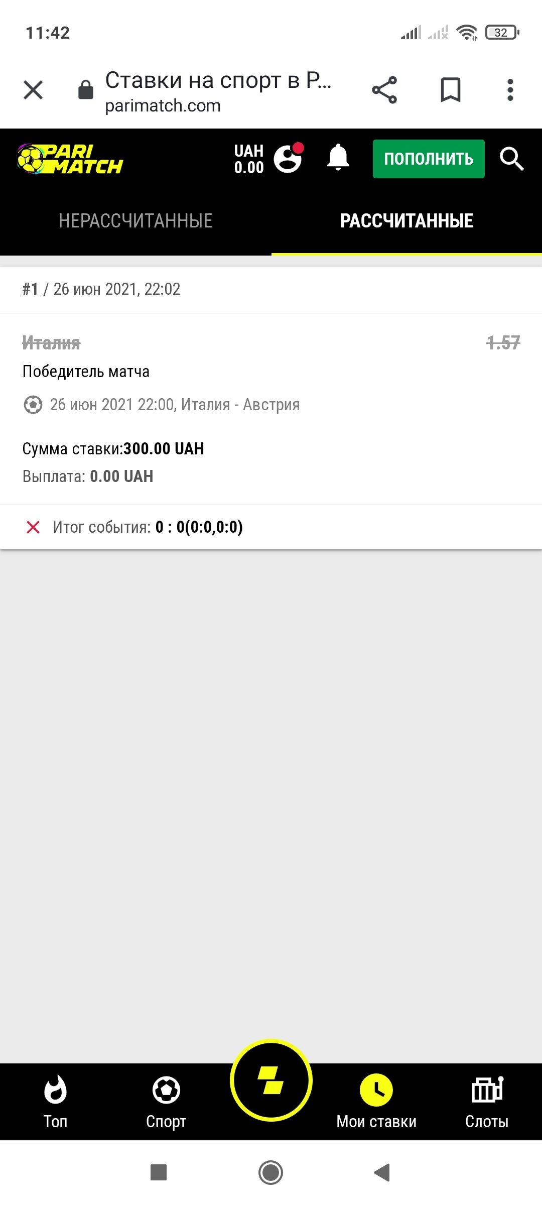 Добрый день, хочу расскать о моей проблеме. Я вчера ставил ставку на то что в матче Италия Австрия победит Италия. В итоге со счётом 2:1 выиграла Италия. Мне написало что счёт 0:0 и то что я ничего не выиграл.