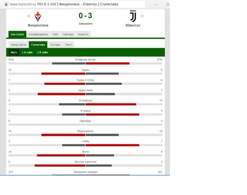 Здравствуйте! Букмекер отказывается пересчитывать купон 4840259019, как выигрыш, ссылаясь на несуществующее правило - Если результат завершённого события, представленный на официальном сайте, отличается от данных видеотрансляции, то расчёт производится по данным видеотрансляции. Этого правила у букмекера нет. А есть другое правило (скриншот 1) - Количество желтых и красных карточек, угловых, попаданий в штангу и перекладину определяется по видео-трансляции. Если трансляция была прервана или не велась, то результат по количеству желтых и красных карточек, угловых берется из официальных источников информации. Все остальные статистические показатели (офсайды, фолы, замены и т.д.) берутся только из официальных источников информации. Замена, совершенная согласно официальному источнику на 46-й минуте, для целей расчета считается совершенной в перерыве. Из официального источника (скриншот 2), Фиорентина совершила 14 фолов, а не 16 как рассчитал букмекер. Как видно из правил, букмекер берет фолы только из официального источника. Ни о какой видеотрансляции речи не идет. Прошу помочь разобраться в данном вопросе. Ссылка на официальный источник