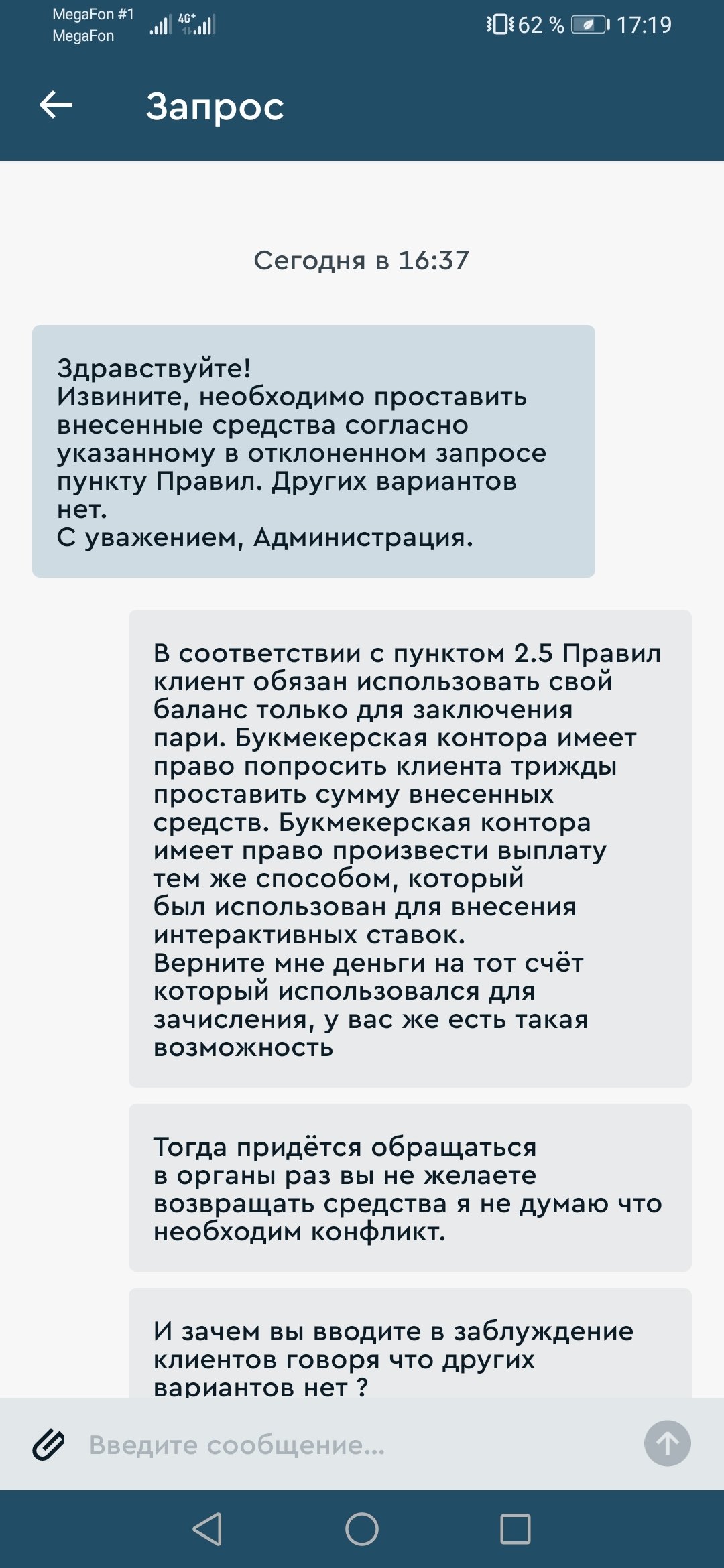 Были зачислены средства на счёт с одной карты, потом эти средства мне понадобились и решил их вывести, так как ставки не ставил и никаких действий не совершал мне отказали в выводе, ссылаясь на то что пытался вывести деньги на другую карту, обязали проставить эти деньги, но в правилах написано что контора может их отправить на карту с которой был сделан платёж.