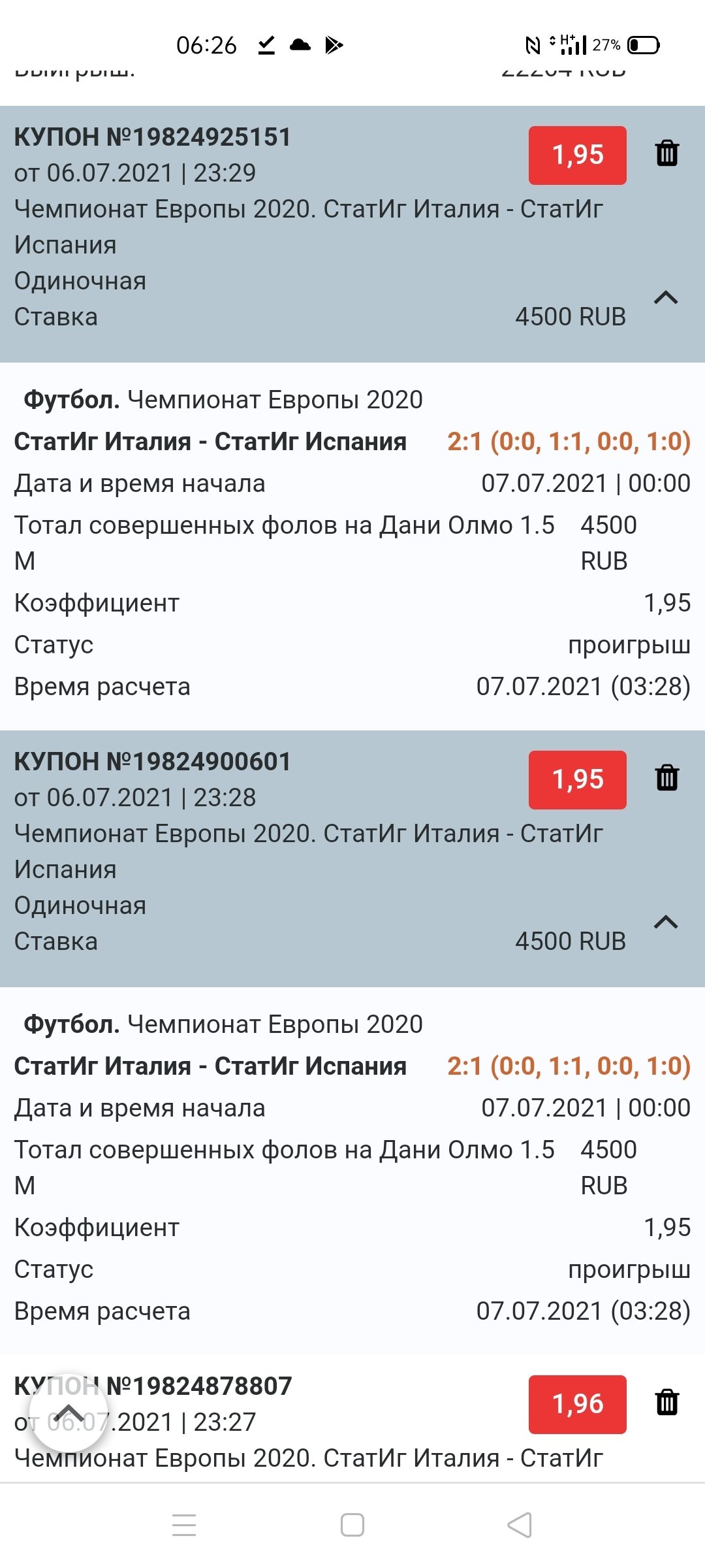 Уже совсем игроков за идиотов принимают. Мне неверно рассчитали ставки 19824925151, 19824900601, 19824878807 и 19824856899. Все 4 ставки сделаны на то, количество совершенных фолов на Дани Ольмо будет меньше 1.5. Изначально в чате оператор сообщил мне о том, что на нем сфолили якобы дважды, затем начал кидать источники, которые только подтвердили, что я прав, а потом вообще начал писать про какие-то мои сомнения в правилах и прочий бред, который я якобы должен был выяснить перед ставками. Хотя никаких сомнений не было в принципе, все четко регламентировано. Согласно правилам, все ставки на футбол рассчитываются только в основное время - 90 мин. Это п. п. 8.1.1. Согласно правилам, ставки с дополнительным временем рассчитываются лишь на проходы и обязательно помечаются в линии «Проход в с. этап» - это п. п. 8.1.2. Евро 2020 рассчитывается через официальный сайт сборных - это п. 9 (основные источники информации). Вот официальный протокол игры: Ольмо сфолил 7 раз, на нем фолили 5 раз. Это видно в графе FS. Из этих 5 раз в основное время на нем сфолили лишь единожды. Вот здесь на том же сайте матч расписан досконально по всем эпизодам (листайте ниже): Четко видно, что первый раз на Ольмо сфолил Верратти на первой мин, больше в основное время фолов на Ольмо не было. Все остальные фолы, коих было еще 4, были в дополнительное время: на 91-й и 97-й мин против него фолил Толой, на 100-й — Пессина, на 106-й — Локателли. Скрины добавлю, но вы можете сами все проверить и сверить. О каких 2 фолах вел речь оператор изначально - непонятно. Непонятно и то, что за дичь он начал городить потом про то, что ставки на игроков рассчитываются с дополнитлеьным временем, ежели каждый знает, что это не так. Все четко регламентировано правилами. Эти ставки на игроков находятся в той же категории, где и ставки на обычные голы игроков. Очевидно, что все рассчитывается только в 90 мин игры. Во-первых, никаких дополнительных пометок в этих ставках нет, во-вторых, этот вопрос я задавал еще до Евро, в третьих, все это четко регламентировано правилами (п. п. 8.1.1 и 8.1.2). Отправил письмо на почтовый ящик. Может, там поадекватнее люди сидят. Но на всякий пожарный решил обратиться в Legalbet. Помогите.