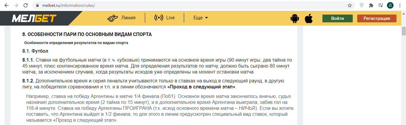 Вы хоть сами осознаете, что п. п., на который ссылается Мелбет, касается ставок на все соревнование/турнир, что выделено в нем жирным шрифтом? Да и примеры с разделом результатов на сайте Мелбет только подтверждают, что прав именно я.