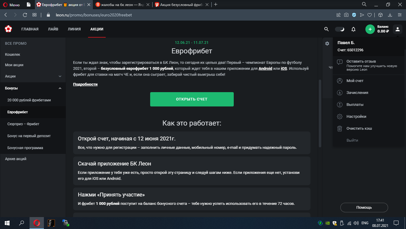 Здравствуйте, вчера зарегистрировался в приложении БК "Леон", после чего зашёл в раздел "Акции" чтобы принять участие в акции "Безусловный фрибет 1000 рублей", но доступа к этой акции не было, вместо кнопки "Принять участие" есть кнопка "Открыть счёт". Помогите разобраться в чём дело