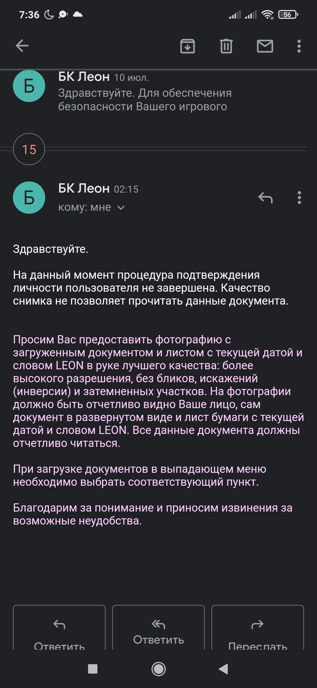 Здравствуйте, столкнулся с такой проблемой в БК LEON, что букмекеры не хотят , чтобы я выводил деньги со счета. Начал выигрывать и 2 раза вывел деньги с этой БК, далее выйграл ещё около 15к рублей и тут мне приходит запрос на верификацию аккаунта. Я подумал, ничего сложного обычная верификация с паспортом и бумажкой с надписью. Отправил фотографию им и сразу же приходит отказ. Скрин ниже. Я 2 часа ночью переделывал фотографии. Все равно приходит отказ. Это явный СКАМ от бк Леон. Ни в одной другой БК такого не было. Прошу помочь