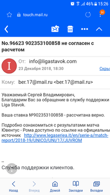 22 декабря сделал ставку на матч Ювентус-Рома на общее количество ударов в створ будет меньше 10,5. По завершении игры количество ударов было ровно 10 (6-4), но каково же было мое удивление, когда мою ставку рассчитали как проигрыш. Я позвонил по телефону горячей линии, чтобы уточнить почему проигрыш, оператор БК создал от моего имени заявку и в этот же день мне на почту пришло письмо, о том что при расчете статистики БК пользуется данными официального сайта итальянской серии А (ссылка из письма . Пройдя по ссылке я еще раз убедился, что количество ударов меньше 10,5 и стал ждать, когда БК пересчитает мою ставку. НО прошла неделя и денег я так и не увидел. Я опять позвонил на телефон горячей линии БК чтобы уточнить что и как. В итоге оператор опять создал заявку, и мне опять пришло на почту от БК письмо с текстом, что "событие рассчитано верно. Обращаем Ваше внимание на пункт Правил приема ставок 3.4.1: Букмекерская Компания рассчитывает пари на основе своих собственных статистических данных о ходе события." Насколько я понял, что все игроки, кто брал это событие - все проиграли))))) те кто ставил больше 10,5, тем БК присылала ссылку на офиц.сайт итальянской лиги А (где кол-во ударов 10), а тем игрокам которые как и я брал меньше 10,5 ударов, БК пишет "пари рассчитано на основе собственных данных")))))))))))))))
