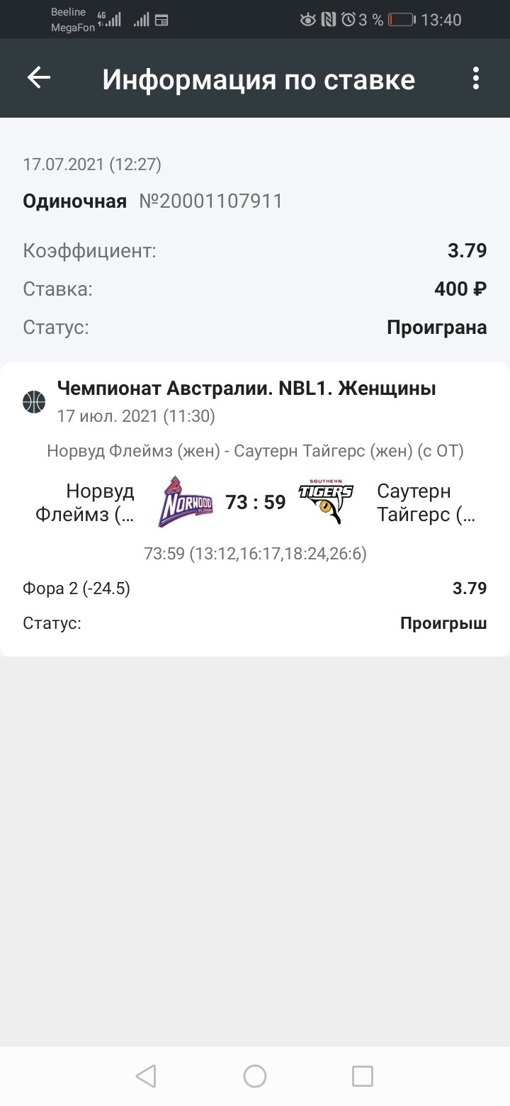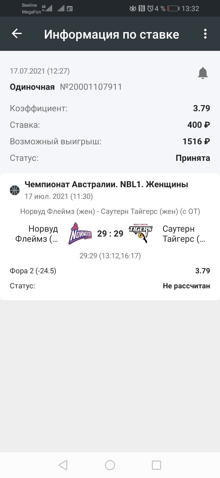 20001107911 Поставил при счёте 31:44 В третьей четверти счёт был 4:12, был тайм аут После таймаута стал счёт 31:46 и матч убрали Захожу на другие источники смотрю счёт 33:46 и все закрыто Открываю трансляцию там счёт 42:48!!!!!! Матч ещё не рассчитали, прошу возврат при любом исходе ставки