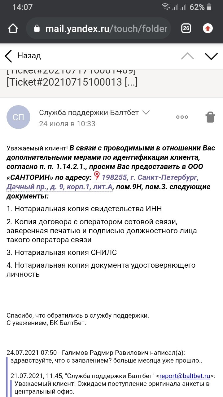 Здравствуйте . Ситуация такая. Мною были сделаны ставки на сайте балбета. После того как приподнял,запросили верефикацию. Написал им на почту,сказали надо явиться в ППС - съездил на следующий день,написал заявление. Кассир сказала что управляющая забрала заявление и отправила . На сегодняшний день пишу им через 2 дня каждый день -заявление мол еще не пришло. Смешно,почти месяц прошел. Либо так относятся к клиентам,либо что,не могу понять. Выплаты не доступны,соответственно. Прошу поспособствовать этому. Спасибо.