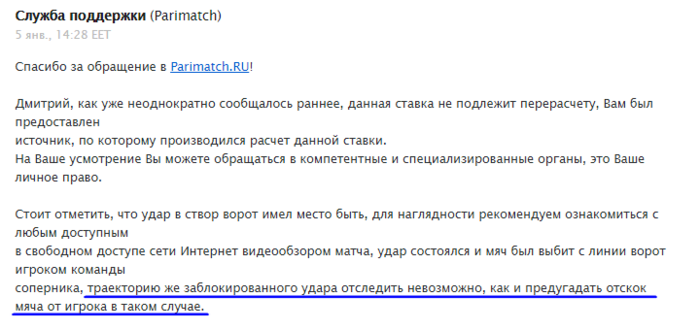 Очередной кидок от Пари Матч, отказ рассчитывать по собственным же правилам. Оформил пари на игрока в матче Ман Сити - Ливерпуль, попадания в створ, Вейналдум, ТМ 0.5. По правилам компании есть четкий список источников, по которым рассчитываются разные соревнования. АПЛ по правилам Пари Матч рассчитывается через официльный сайт, который четко прописан (скриншот ниже). На официальном сайте на странице с матчем во вкладке Latest поминутно расписаны все основные события, удары в створ обозначены либо как Goal (если это гол), либо как Attempt saved (если это спасение). Так вот, Вейналдум имеет только заблокированный удар, ударов в створ у него нет. Источник: Однако пари на ТМ рассчитали как проигрыш. При обращении в СП, изначально утверждали, что через этот сайт и рассчитывали, потом прислали данные с Whoscored, а на мой вопрос, причем здесь этот сайт, если есть четкие правила, мне ответили, что "п. 3.4: "Букмекерская контора объявляет действительные результаты на основании официальных протоколов и других источников информации непосредственно после завершения события. При возникновении спорных ситуаций, при несовпадении результатов, размещенных различными источниками, при их очевидных ошибках, окончательное решение об определении результатов для расчета выплат принимает букмекерская контора."Спрашиваю, причем здесь этот пункт правил (как я понимаю, вспомогательный, если на официальном сайте не будет информации - о чем в нем самом и говорится), если на официальном сайте есть четкая информация. Ответ один - "Окончательное решение по расчету ставки оставляет за собой право Букмекерская контора." Налицо доказан факт того, что данная БК рассчитывает ставки так и только так, как выгодно ей самой. Собственные правила свернули в комок и выбросили в мусорное ведро. Видел здесь уже множество обратных жалоб, когда игроки пытались донести до конторы очевидные удары в створ, которые по каким-то причинам не были учтены на официальных сайтах, местный администратор разводил руками, признавая жалобы необоснованными, так как вроде бы есть источник и с ним не поспоришь. Здесь же абсолютно противоположная жалоба, когда уже сам букмекер юлит и пытается выжать максимум для себя, нарушая собственные правила. Посмотрим, чего теперь добьется Легалбет ! И не создаст ли двойные стандарты, в которых вечно будет прав букмекер. Прямым текстом говорю, мне не интересно, что там на других сайтах, есть четко прописанный источник, на нем есть вся информация в графе Latest, значит, расчет производится так и только так, как написано в правилах. И никак иначе. Прикреплять сюда дополнительные пункты, в которых так и говорится, что при отсутствии или ошибках на официальных сайтах БК имеет право считать по иным источникам, не надо, так как вся информация есть на официальном сайте.
