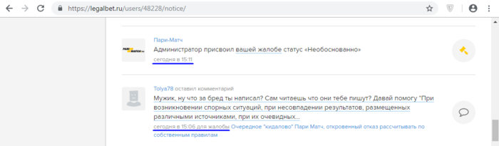 Что касается первой жалобы - то это вообще какой-то абсурд. Вы пишите про какие-то мои оскорбления, хотя я на самом деле только подозреваю вас в покрывательстве данной конторы, у меня есть мнение, и оно имеет место, вы же, как я понял, прямо заявляете, что я мошенник. Так в чем проявилось мошенничество? В том, что я оформил VIP-пари? В том, что сделал скрин непосредственно перед игрой, чтобы убедиться, что ничего не отменили? Не перегибаете ли вы, уважаемый? Если надо, я вам предоставлю скрины оригинальные (без пояснений и пометок), и вы своим экспертным взором проверите - есть ли там какие-то редактирования. А то, что вам там какие-то пруфы предоставили, так это только писанина, мои же скриншоты самые, что ни на есть настоящие. Если уже вы горой за Пари Матч, то лучше подскажите, почему они статус по VIP-заявкам не прописывают четко? Как проходит дело - оформляешь VIP-пари, появляется сообщение, что оно на рассмотрении, тут же заходишь в историю счета, и вуаля - стоит пари, статус не указан, написано, что как бы стоит, и что вот он возможный выигрыш, а на деле, как оказывается, его еще могут и не принять. Это норма? Вот ответьте, пожалуйста, не забудьте.