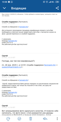 Постоянно проигрывал в Париматч и все было хорошо. Как-только первый раз выйграл, в 20-х числах декабря 2018 года заблокировали возможность делать ставки и возможность выводить деньги. Начали дополнительную "верификацию аккаунта" (хотя при регистрации все сканы, фото и данные предоставил). Уже около месяца каждые несколько дней присылаю им данные - трижды присылал фото меня с паспортом на фоне надписей разные ("верификация для париматч" и дата, "parimatch" и дата и т.п.). Три или два раза уже запрашивали фото меня с паспортом. Запрашивали повторно фото с паспортом. Теперь отправил скрин фото кошелька. Такое ощущение, что они надеются, что когда-нибудь я пришлю что-то не то (хотя все мы понимаем, что просто затягивается время перед возвратом денег). Так вот, Париматч не возвращает деньги и вот уже более двух недель запрашивает данные. Причем одни и те же. Будьте аккуратны. Лучше положите деньги в более честную контору. p.s. регистрировал и пополнял через Первый Цупис, все данные корректны, любое подтверждение могу прислать, так как ни в чем не обманывал. Раздражает, что отнимают мои деньги.