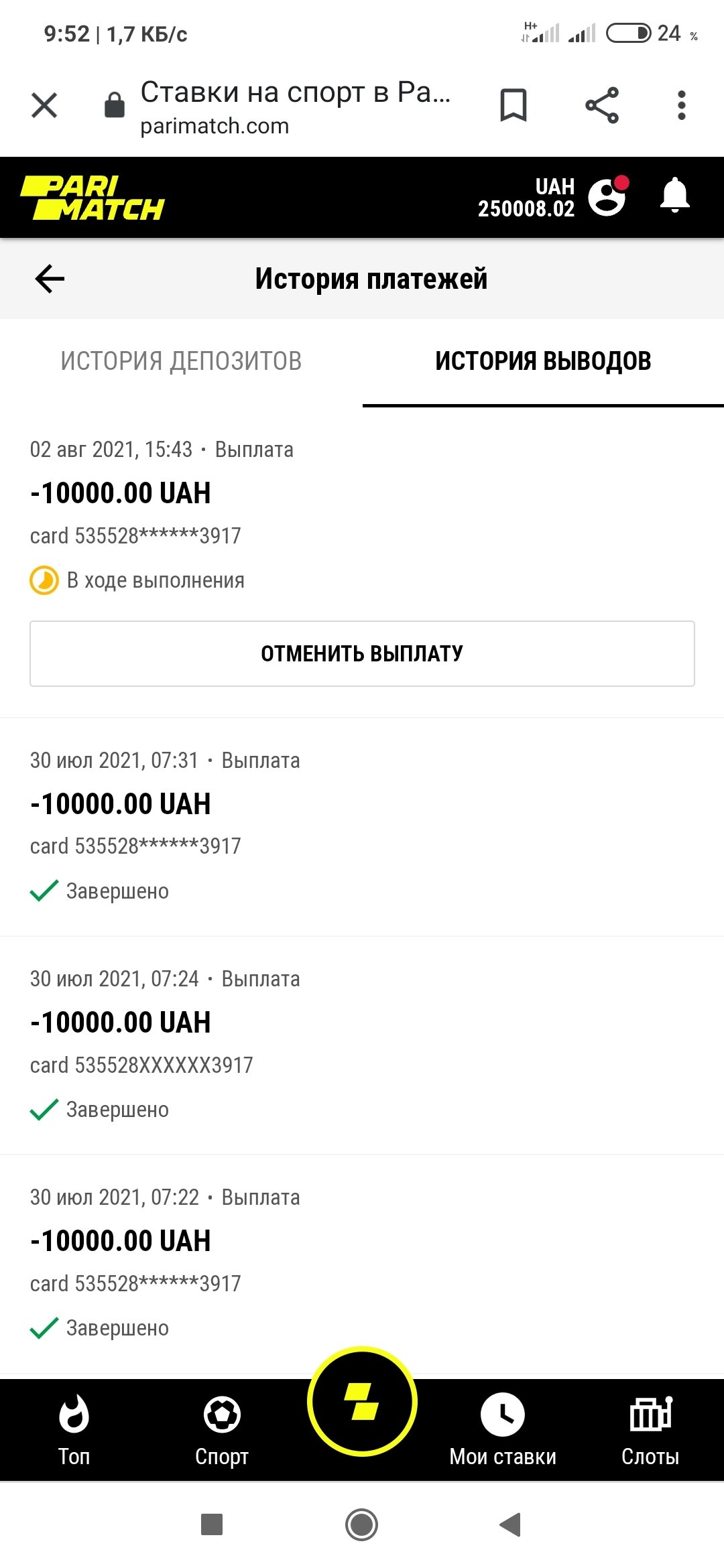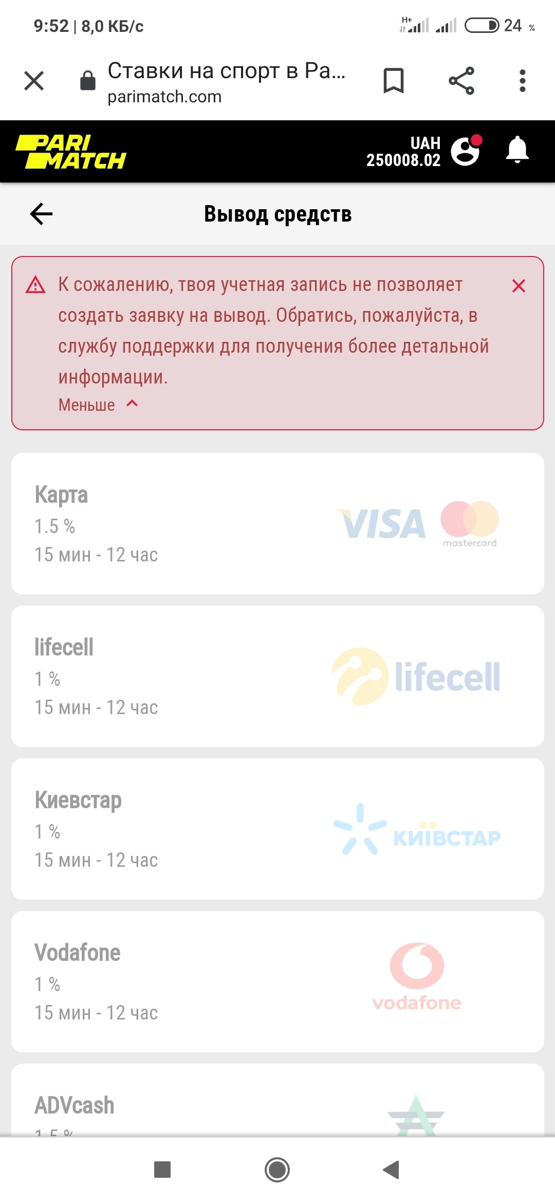 Сдравствуйте.Выграл не маленькую сумму на пари матч,но вывести не могу.Хотя до этого выводил всегда в течение 5 минут.Сейчас пишет не возможно вывести с этой учётной записи.Я так понял деньги на вывод заблокировали,хотя дальше играть могу.В службу поддержки обращался,сказали проверяют на мошенничество,и по времени точно не сказали сколько это займет.Помогите пожалуйста,не хочу потерять деньги.Есть все скриншоты.