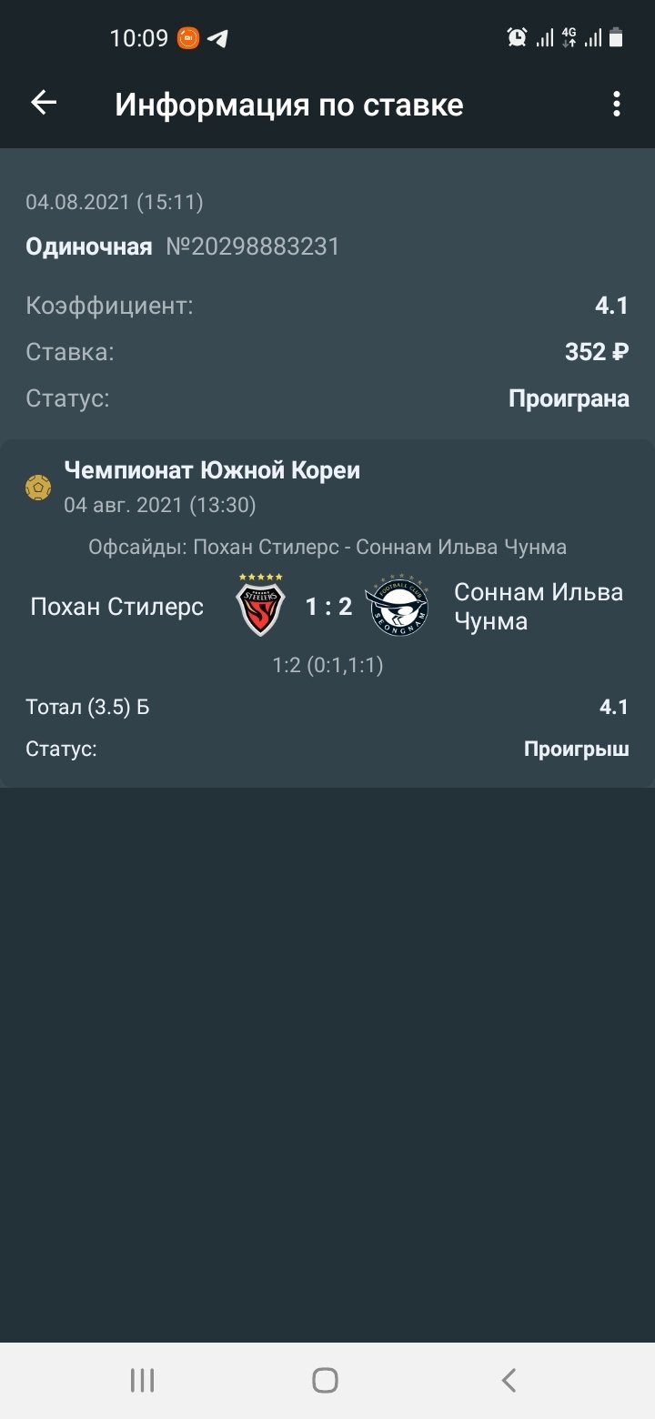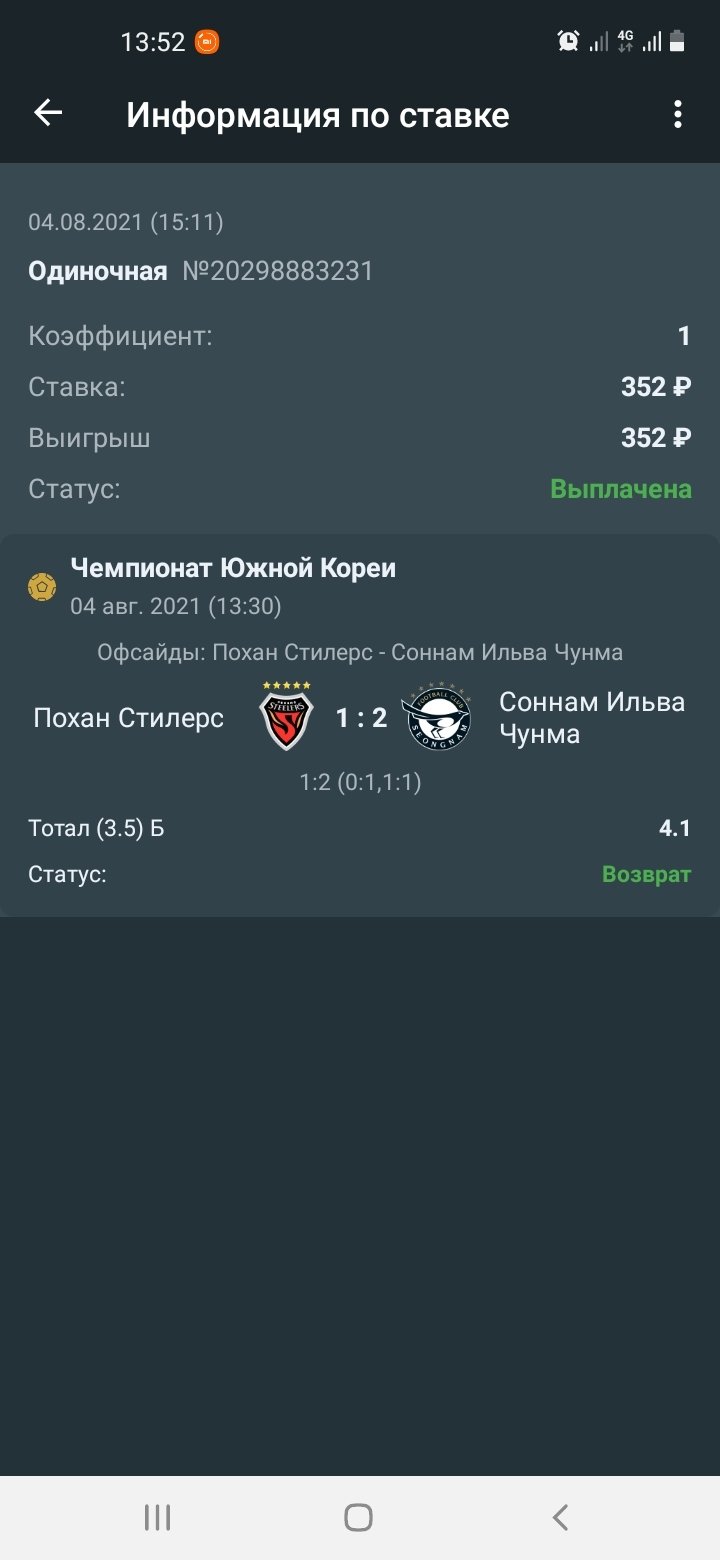 Здравствуйте, тема такая! года сделал ставку на матч чемпионата Кореи Пхохан- Соннам на ТБ 3.5 офсайдов, ставку рассчитали проигрышем, захожу на лайвскор смотрю там 4 офсайда, захожу на другие спортивные сайты тоже 4! Пишу в поддержку, говорят смотрите официальные источники! Нашёл в их списке источников, официальный сайт чемпионата Кореи и вуаля 4 офсайда! Пишу в поддержку, говорят предоставить мне время каждого офсайда в матче, короче ничего не добился