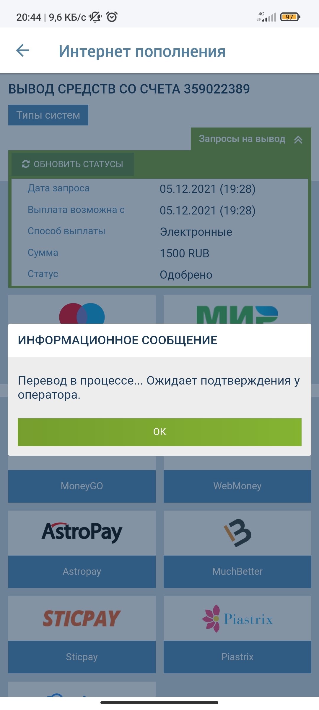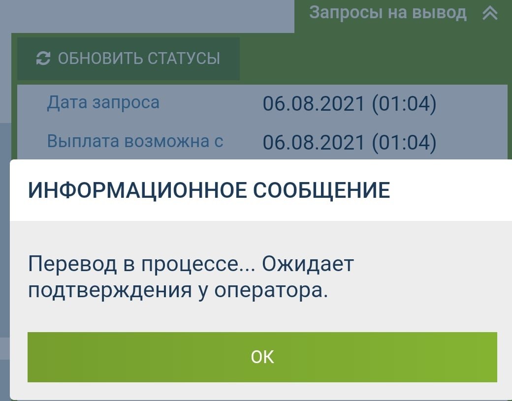 Поставил на вывод средства, запрос был одобрен, средства со счета списались, однако деньги не пришли на карту. В истории запросов, нажав на статус выскакивает информационное сообщение "Перевод в процессе... Ожидает подтверждения у оператора". В поддержке сообщили, что запрос был составлен некорректно , хотя карты сохраненные и ранее проблем с выводом не возникало. Помогите со скорейшим возвратом средств.