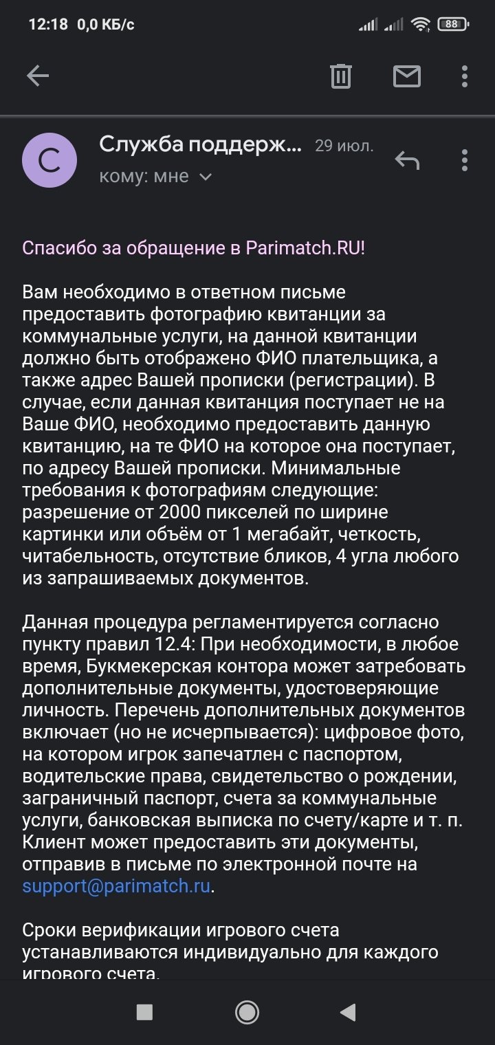 года дёрнуло меня завести деньги в данную "контору". Поиграл-выиграл-порадовался. Но радость была недолгой. Захотел вывести - затребовали повторную верификацию. Ну что ж ,требование нормальное-предоставил фото паспорта, жду. Через день - пришлите фото квитанции ЖКХ (????) - прислал. Ещё через день () фото паспорта с пропиской - прислал. С тех пор - тишина. В понедельник я намерен подавать жалобы в Роскомнадзор и Прокуратуру на незаконный сбор личных данных ( квитанция ЖКХ ) , содержащих информацию о третьих лицах, не имеющих отношения к верификации.