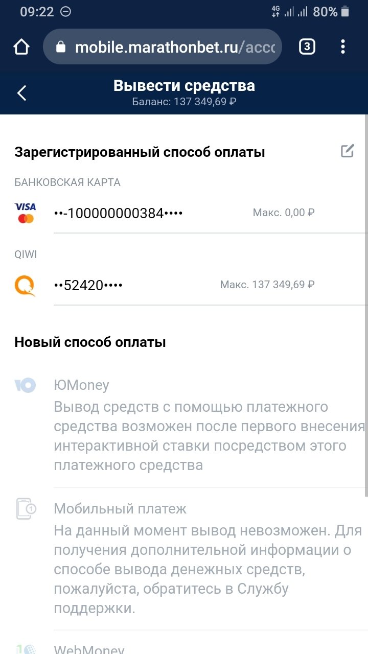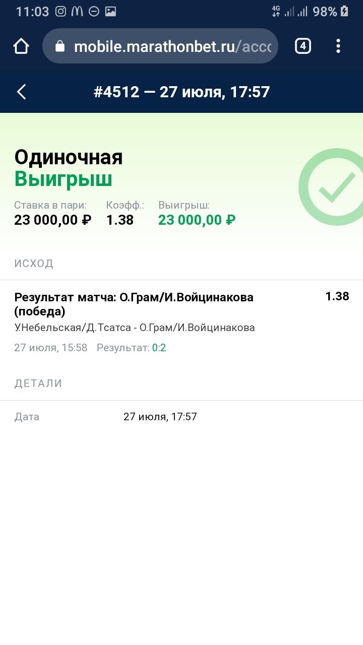 Доброго времени суток! Прошу провести проверку, касаемо букмекера . Играю в этой конторе довольно таки давно, за всё время было совершено 4512 ставок, на различные виды спорта. года мной были совершены 5 ставок на один матч в теннисе, который был впоследствии сыгран в плюс. Однако, исход рассчитали возвратом, прислав на электронную почту письмо следующего содержания : « Ваш выбор ([У.Небельская/Д.Тсатса - О.Грам/И.Войцинакова]: Победа с учетом форы по геймам - О.Грам/И.Войцинакова) по ставке в пари (№ 4511) был отменен согласно пункту Правил 7.1.3, т.к. коэффициент был указан с очевидной опечаткой. Приносим извинения за доставленные неудобства.» Сразу же после этого запросили якобы случайно верификацию. Необходимые документы были отправлены практически сразу (первая страница паспорта с фотографией и страница с пропиской). Ставки порезали до 18 рублей максимум на любой коэффициент. Вывод средств заблокировали. На следующий день, года, спустя почти сутки, на электронную почту пришло еще одно письмо, с требованием загрузить фотографию с паспортом в открытом виде в одной руке и листом бумаги с написанными цифрами в другой руке. Данную фотографию я также сделал в этот же день и отправил букмекеру. года в 09:10 по МСК на электронную почту пришло письмо следующего содержания : «Ваш игровой счет в компании БК «Марафон» был отобран для стандартной проверки. Эта проверка все еще продолжается. Благодарим Вас за терпение. Мы свяжемся с Вами сразу же после завершения проверки.» В службе поддержки отвечают неохотно, точных сроков прохождения проверки не называют и вежливо просят набраться терпения. По моему мнению уже прошло достаточно времени для проверки представленных документов и складывается такое чувство, что букмекер не хочет мне выплачивать немалую сумму денежных средств, которые я выиграл честным путем. Помогите разобраться в сложившейся ситуации: в корректном перерасчете выигрышных ставок, разморозке счёта и выплате денежных средств.