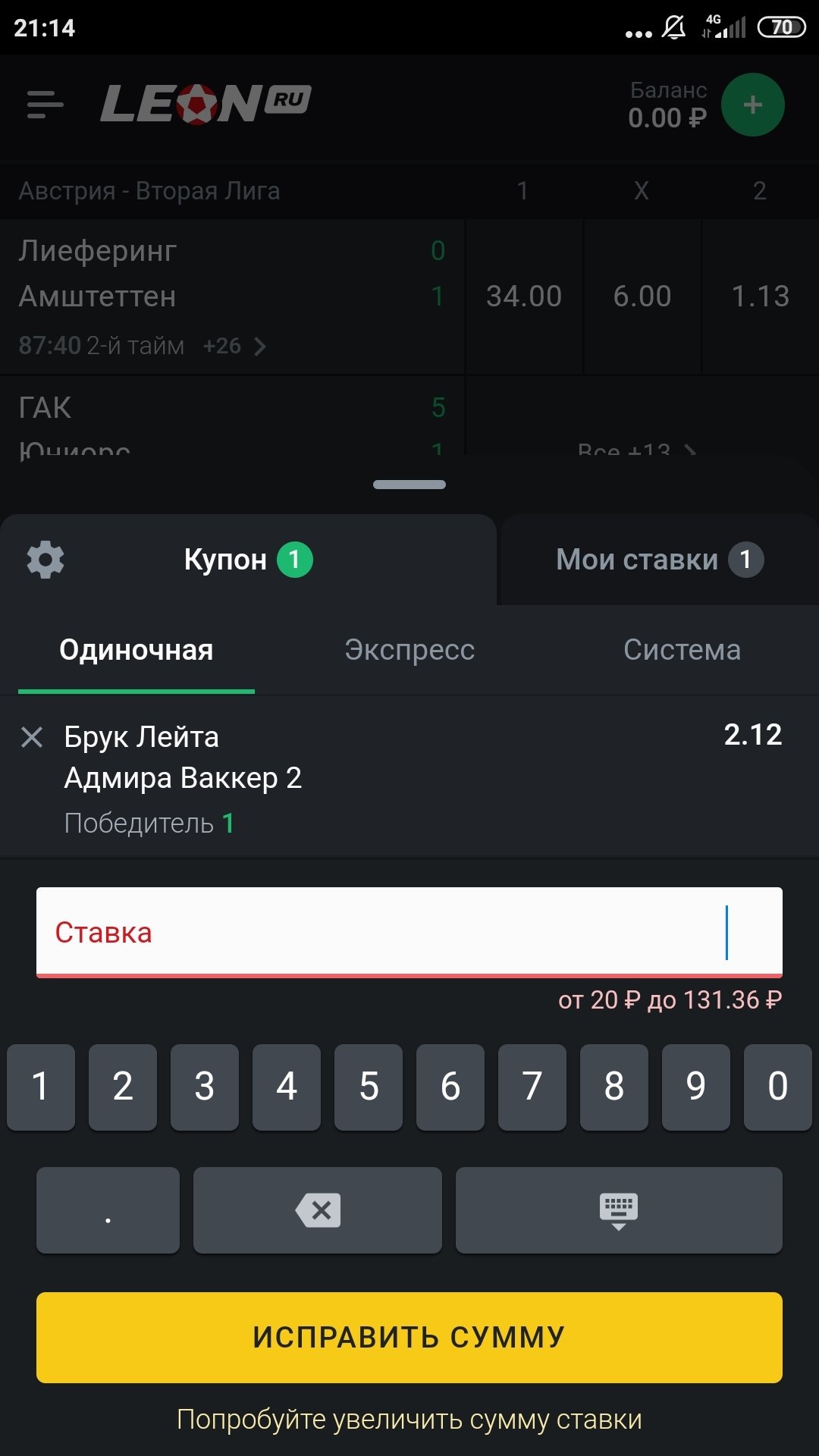 Селтик - Яблонец кф 1.12 поэтому сумма 5000, для отыгрыша нужен кф от 1.85, соответственно максимум был рублей 500