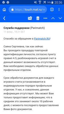 Необосновано заблокировали счёт,зарегестрировалась на сайте,прошла идентификацию через 1Цупис,начала играть,все пари сделаны на разные матчи,никаких вилол,повторных ставок не было,выиграла 12300р,после этого счёт был заблокирован ,написала в чат,сказали пишите в поддержку на ихний эл.адресс,там пишут что необходима повторная идентификацию,сказали выслать фото паспорта и фото с паспортом в руках,отправила им на почту всё,там пишут что надо ждать 10 рабочих дней!Я хотела узнать на каком оснований это происходит,там не говорят.Помогите пожалуйста вернуть честно выигранные деньги!Получаеться что если клиент этой конторы начинает выигрывать даже небольшую сумму его сразу блокируют и ты виноват только в том что посмел выиграть у них.