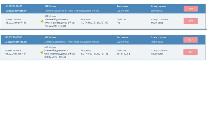 Ну так ставки выглядят очень логичными, сделаны по всей видимости при чете 5:5, каждый брал свою подачу. Отсюда расчет на тай-брейк смотрится, надо еще просто по подаче взять, что давалось обоим. И далее вторая ставка на более сильного игрок -, на Вердаско в сете. Опять логично. И суммы ставок ваши.