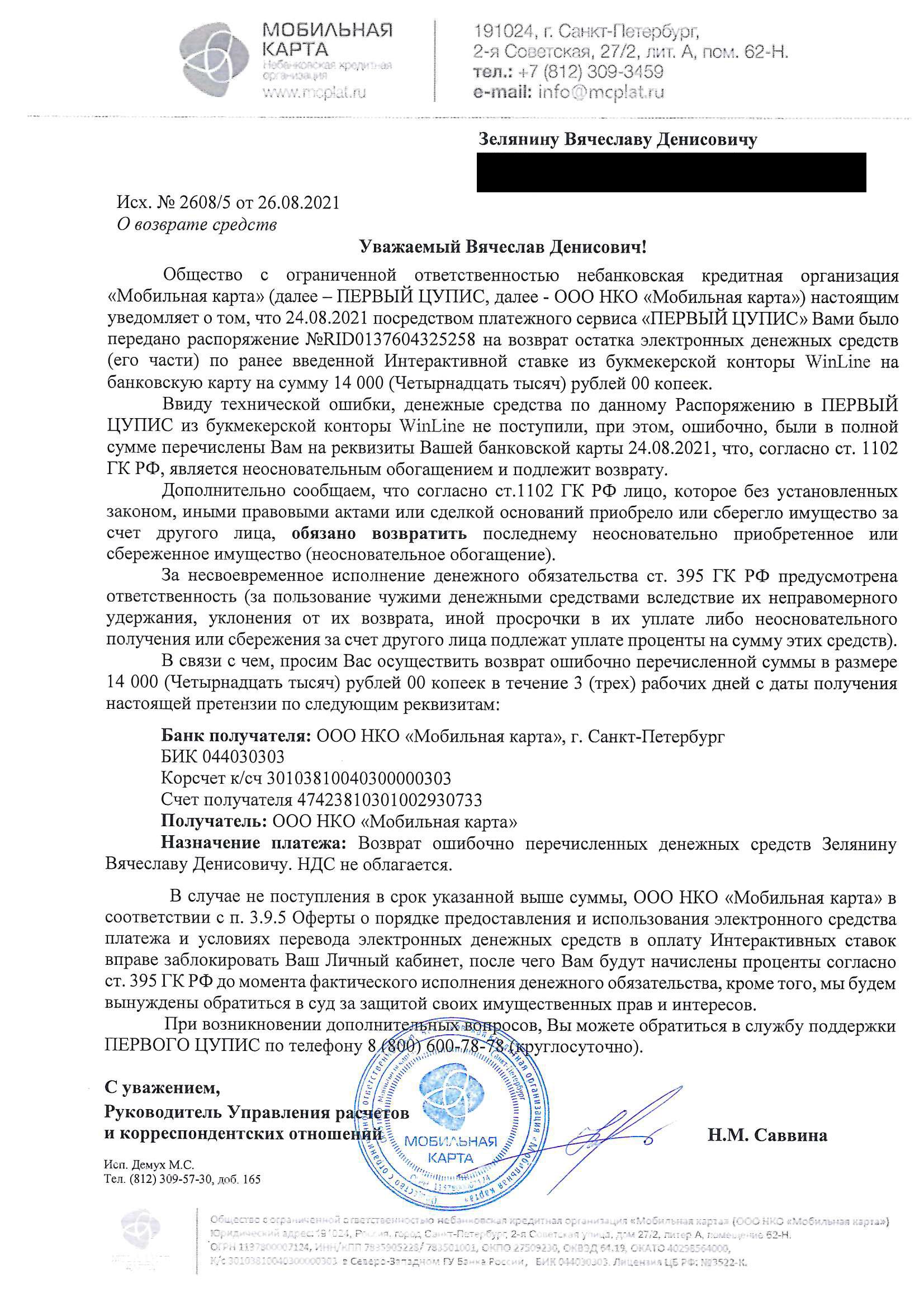 Пока не совсем жалоба. Пишу для объективного рассмотрения, а то 1ЦУПИС в ультимативном тоне прислал письмо. Ситуация интересная. 1ЦУПИС выплатил на карту 14 тысяч, которые были заказаны в Винлайне. 1ЦУПИС якобы не получил от Винлайна деньги из-за ошибки, и теперь требует с меня возмещение этой суммы. При заказе действительно появлялось сообщение об ошибке. Вроде бы только со второго запроса как-то криво прошла транзакция. Я особого внимания не обратил, деньги упали на карту и ладно) После этого сразу заказал еще одну выплату на 14 тысяч, и она прошла нормально. Итого на карту пришло 28 тысяч. В истории и в лк 1ЦУПИС и в Винлайне сейчас только одна выплата на 14 тысяч. В чем вижу проблему. Я на 100% уверен, что при "проблемной" выплате деньги с баланса в Винлайн списались (баланс расположен над формой заказа и он сразу уменьшается на сумму выплаты) А вот вернулись ли деньги после того как платеж закончился как бы ошибкой, я не видел. Дело было поздним вечером. Выплаты я заказывал две. Часть денег висела в нерассчитанных ставках. После этого сделал еще много ставок. Так что восстановить историю баланса по памяти я сейчас объективно не смогу. В такой ситуации, возместив 1ЦУПИСу 14 тысяч, может оказаться, что я "оплачу" эту выплату дважды: сейчас возмещением и той суммой, которую списал Винлайн и не факт, что вернул. Самому из истории 1ЦУПИС и Винлайн ничего не вытащить. Чат Винлайн бесполезен. Говорят: у вас от 24-го числа одна выплата, идите в ЦУПИС. На данный момент отправил емэйлом в Винлайн номер "проблемной" транзакции, а также запрос на историю счета, в которой отображался бы общий баланс счета после транзакций.