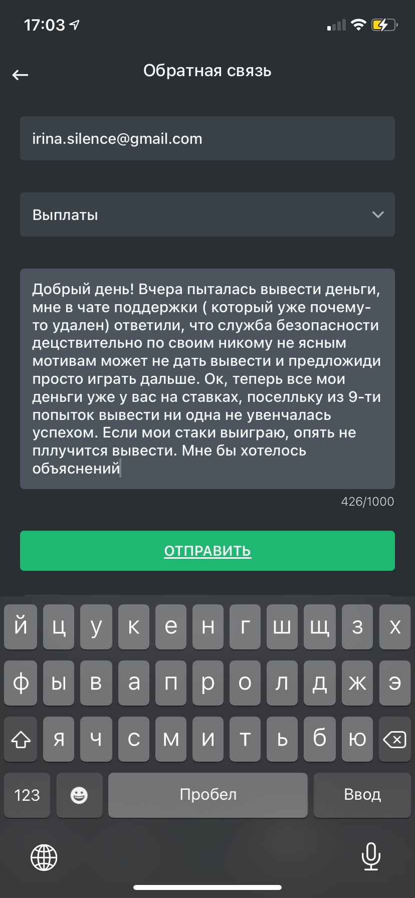Добрый день. Завела деньги в Леон, сделала несколько ставок, получила фрибет, поставила и его. С нескольких мелких ставок что/то выиграла и хотела вывести. Просто отклоняется вывод и всё. Поддержка пишет, что отклоняет служба безопасности без объяснения причин) Пишет - играете дальше))) Ок, поставила ещё) Ещё выиграла по мелочи. Опять не выводится. При том, что ещё пара ставок у меня там есть. Сумма маленькая, но с каких таких я должна дарить это конторе