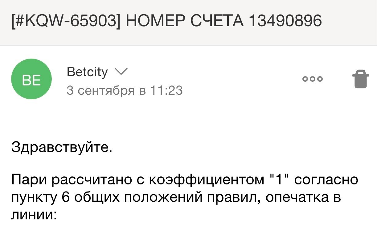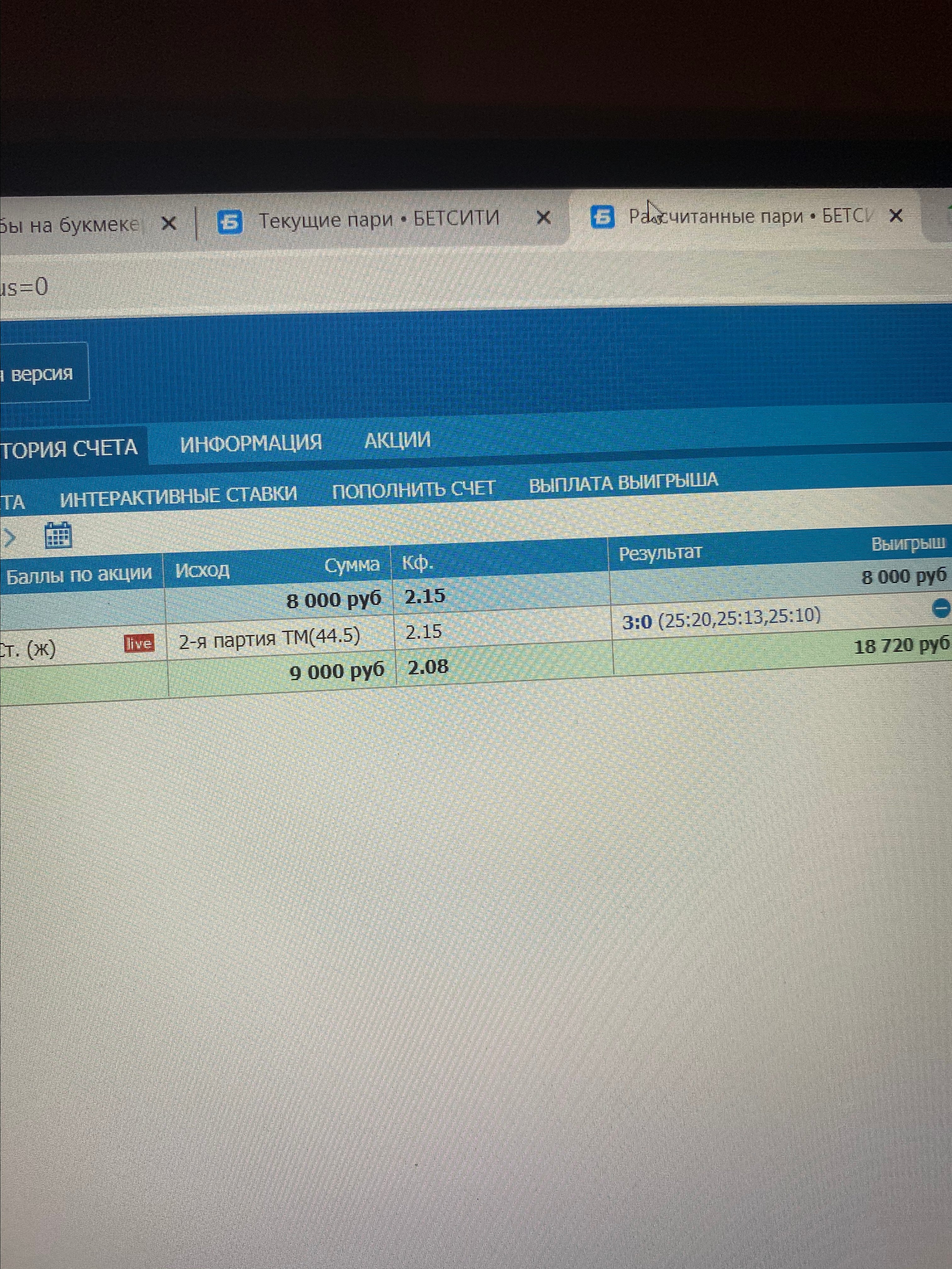 ПАРИ НОМЕР 14 СДЕЛАЛ СТАВКУ НА ВОЛЕЙБОЛ Техас Крисчен Хорнд Фрогс (ж) — Николлс Ст. (ж) , НА ТОТАЛ МЕНЬШЕ 44.5 ВО ВТОРОЙ ПАРТИИ, КОЭФФИЦИЕНТ БЫЛ , ПО ИТОГУ ИГРЫ ДАННАЯ СТАВКА ВЫИГРАЛА, БУКМЕКЕР ЗАБЛОКИРОВАЛ ДОСТУП К МОЕМУ АККАУНТУ , ПИСАЛ В СЛУЖБУ ПОДДЕРЖКИ ОНИ ИГНОРИРОВАЛИ МЕНЯ 2 ЧАСА ПОСЛЕ ЧЕГО РАЗБЛОКИРОВАЛИ КАБИНЕТ И ВЕРНУЛИ СТАВКУ, ХОТЯ МОЯ СТАВКА ВЫИГРАЛА ИСХОДЯ ИЗ ИТОГОВОГО СЧЕТА ИГРЫ , НАПИСАЛ ИМ НА ПОЧТУ ОНИ ССЫЛАЮТСЯ НА СВОЙ ПУНКТ ЧТО ИМЕЮТ ПРАВО ПРОИЗВЕСТИ ПЕРЕРАСЧЕТ, ПОЧЕМУ КОГДА СТАВКА ВЫИГРЫВАЕТ КОНТОРА НЕ ОТДАЕТ МНЕ МОИ ВЫИГРАННЫЕ ДЕНЬГИ?КОЭФФИЦИЕНТ БЫЛ НОРМАЛЬНЫЙ ЭТО НЕ ОШИБКА И НЕ ЗАВЫШЕННЫЙ , БЕТСИТИ НАГЛО РЕШИЛО КИНУТЬ МЕНЯ , ОЧЕНЬ ПРОШУ ПОМОЧЬ С РЕШЕНИЕМ ДАННОЙ ПРОБЛЕМЫ, ТАК КАК ЭТО ЯВНЫЕ НЕПРАВОМЕРНЫЕ ДЕЙСТВИЯ СО СТОРОНЫ БК БЕТСИТИ , МОЯ СТАВКА ВЫИГРАЛА , КОМАНДА НА КОТОРУЮ Я СТАВИЛ ЗАБИЛА МЕНЬШЕ 44.5 ВО ВТОРОЙ ПАРТИИ , ПРОШУ ПРОИЗВЕСТИ ПЕРЕРАСЧЕТ НА ВЫИГРЫШ, БЕТСИТИ НЕДОБРОСОВЕСТНЫЙ БУКМЕКЕР