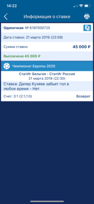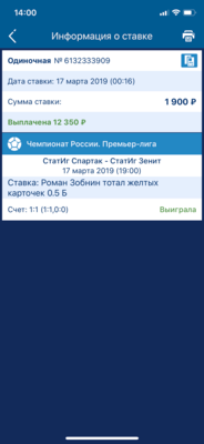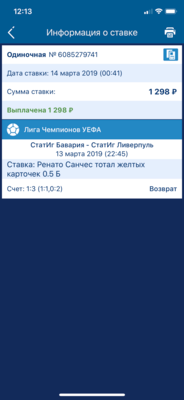 Добрый день. 10 марта,я смотрел матч Бавария-Ливерпуль и решил онлайн в конце матча,поставить что игрок Баварии Ренато Санчес получит карточку жёлтую,поставил 1298 рублей,за кф 19,так как играть оставалось около 10 минут в матче. И мне повезло,секунд через 40 после ставки,он действительно получил жёлтую карточку. Мне рассчитали как выигрыш. Прошло 10 дней и мне сделали вдруг возврат,объяснив это тем,что было заранее известно событие,которое не отобразилось у них в системе...но я если бы я знал,что у него уже есть карточка,я бы наверно поставил не несчастную тысячу на это,а больше за такой то кф. Вот так сработала эта бк.