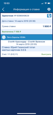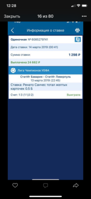 Я часто ставлю на жк,из последних выиграшей были эти,проигрышей конечно больше. Но разница в том,что в лиге чемпионов,можно ставить на карточки,когда матч идёт уже,и почти до конца игры,поэтому в конце игры кф уже большие очень. Он вышел на замену до этого,в центр поля,я подумал свежий игрок,сейчас может активно начать играть,и был хороший кф,играть то осталось мало в матче,думаю ну поставлю тысячу с небольшим там,чтобы на счету ровная сумма была…и повезло как,после ставки буквально почти сразу,он ее получает…ну согласитесь если бы я знал уже эти,ставка была бы больше намного за такой то кф. В кои то веки повезло так,а бк делает такие вещи,причём спустя 10 дней после события этого. Да,бывает иногда когда бк не убирает вовремя кф,когда например игрок уже заменён,и какое то время можно поставить,что он не забьет гол в матче,поставить большую сумму на маленький кф,но это видно сразу и бк делает возврат потом справедливо.Когда бк права и делает возврат,потому что у них проблемы в системе,это справедливо и такие ставки хорошо видны,сам так делал,и это честно,что они делают возвраты потом. Но когда вот повезло,возврат делать несправедливо. Много ставил на жёлтые карточки и по истории счета это видно,на другие игры,и невозможно так поймать карточку,система реагирует сразу,когда есть что то только похожее на жк,да ну и если бы я знал,поставил бы наверно сколько было можно по лимиту,а по моей сумме ставки даже видно,что она была поставлена,чтобы ровная сумма осталась на счёте. Поэтому 1298 рублей.