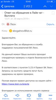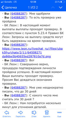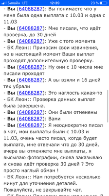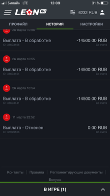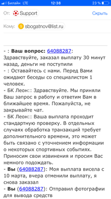 Здравствуйте, являюсь клиентом данного букмекера, и заказал выплату средств, деньги не пришли, написано в обработке было, я написал в чат, мол почему так долго, ответили - ваша выплата проходит стандартную проверку, идёт уточнение спортивных событий. Все ставки рассчитаны, что уточнять, не понятно. Через пару дней я написал снова, ответ был тот же самый, на этот раз я спросил - могу ли я помочь вам уточнить результат, на что мне ответили - как только проверка пройдёт, ваша выплата будет одобрена. вчера, зайдя на свой игровой счет, я увидел что мои выплаты от и отменили, решил снова сделать запрос, но увидел оповещение о запросе документов, должно было придти письмо на почту со списком, но оно не пришло, обратился в чат, написал что надо прислать, выслал, документы одобрили быстро и я сделал запрос на выплату, но выплата так и не пришла, я снова обратился в чат, мне опять тоже самое - ваша выплата проходит проверку, ожидайте, как только она пройдёт проверку, ваша выплата будет одобрена, я решил уточнить, с какого числа идёт эта проверка до 30 дней, на что мне ответили, что с сегодняшнего, , это просто безобразие какое-то, мои запросы на выплату были сделаны и , уже тогда в чате мне писали - идёт проверка, которая может продолжаться до 30 дней! Ниже представлены скриншоты отмененной выплаты, за не отображается в истории, сумма не маленькая зависла, также представлена история переписки в чате и в конце был передан запрос специалистам, на что получен ну мега тупой ответ, извините, я человек эмоциональный, деньги не выплачиваются с , накипело. Просьба администрации сайта помочь.