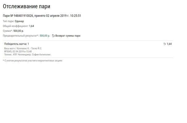 Пример № 3 В теннисном матче при счёте 1:0 (6:4; 5:5) первый игрок отказывается продолжать игру, или дисквалифицирован. Расчёту подлежат все пари на первый сет, а также пари, исход которых однозначно определён – «Тотал второго сета (9,5)», «Тотал второго сета (10,5)», «Тотал второго сета (11,5)», «Фора второго сета (+/- 2,5)», «Фора второго сета (+/- 3,5)», «Тотал «Весь матч» (20,5)», «Тотал «Весь матч» (21,5)» и т.д. Все остальные пари подлежат расчёту с коэффициентом «1».