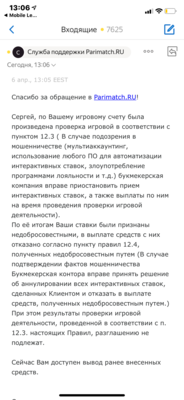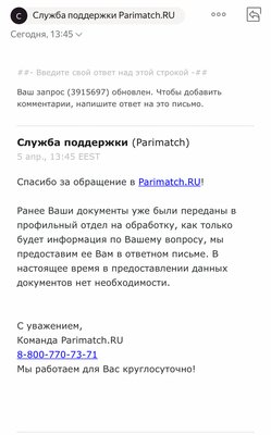 Сегодня париматч влепил мне повторную верификацию. При этом причин я не вижу никаких, пополнял с верифицированного киви кошелька через верифицированный цупис. В данной жалобе я прошу париматч четко обозначить сроки проверки и необходимые документы, для проверки. Поскольку множество пользователей обоснованно заявляют, что администрация париматч намеренно затягивает сроки проверки с помощью запрашивания все новых и новые документы, тем самым продлевая срок проверки.