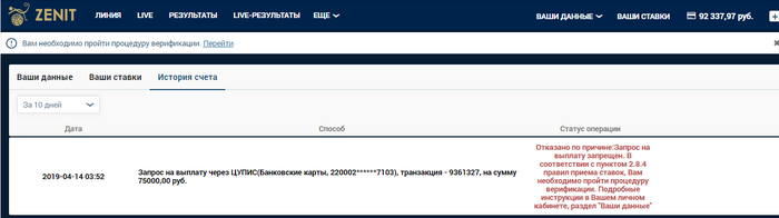 Если раньше был "Запрос на выплату отменен", прошли изменения и деньги стали доходить до выплаты, но не выплачиваться! На сегодняшний день "Зенит" до сих пор удерживают мои деньги и не выплачивают!! на 15.04. "Отказано по причине:Запрос на выплату запрещен. В соответствии с пунктом 2.8.4 правил приема ставок, Вам необходимо пройти процедуру верификации. Подробные инструкции в Вашем личном кабинете, раздел "Ваши данные" ", а ранее как сообщил "Представитель БК" мои документы были приняты 06.04! На сегодняшний день верификация не проведена! Деньги мной не получены!