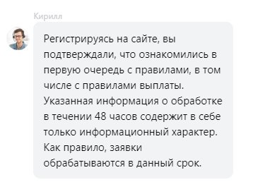 Здравствуйте, хотелось бы обратиться вам за помощью. Ситуация следующая. Зарегистрировался я в данной конторе в марте 2018 года поначалу играл часто где то выигрывал где то проигрывал! Затем не помню по какой причине перестал играть в данной конторе! И вот пришло мне письмо на почту с какой то рекламной акцией от бингобум и я вспомнил что у меня есть данный счет в данной конторе! не играл в данной конторе после перерыва месяцев 8! И вот решил поставить ставку и она зашла, не долго думая поставил все на вывод, Жду час денег нет жду два так же деньги не поступили, думаю странно ведь раньше они выводили чуть ли не мгновенно. Решил написать в поддержку мне сказали вывод осуществляется в течении 48 часов, думаю ну ладно подожду! На следующий день смотрю заявка так же на модерации, думаю опять узнаю! Пишу и мне начинают говорить мол