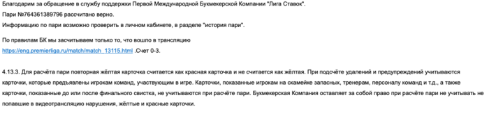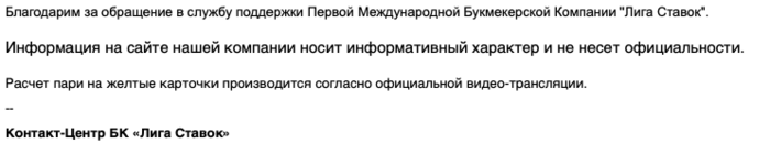 Присылал им скриншоты с матч-центра опубликованном на сайте БК Лига Ставок и просил разъяснить , почему они результаты выкладывают одни , а рассчитывают по другому , внятного ответа так и не дождался. Больше всего убил тот пункт "По правилам пари мы засчитываем только то что вошло в трансляцию" счет 0-3