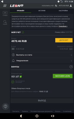 После выигрышей БК "Леон" попросил предоставить документы. Предоставленные мной - инн,военный билет,квитанцию на коммунальные,чек об оплате этой квитанции,фото с паспортом в руке,фото с паспортом в руке и листом,где написана дата и роспись - в другой; Это оказалось недостаточно. Видеоверификация. Ладно. В назначенный период времени я позвонил,со мной связалась девушка-оператор. Задавала вопросы,на которые я подробно ответил (с примерами). Она попросила меня назвать номер моего игрового счета,что я и сделал. (хотя на сайте сказано что нужно показать паспорт,она этого не попросила)И через некоторое время мне приходить письмо,что мой аккаунт заблокирован окончательно. На счету оставалось 4970 рублей.Если блокируете безосновательно,верните хотя бы остаток счета! Крайне негативные впечатления от этой БК,не рекомендую никому.Причину блокировки называть отказался.Номер счета: 63097981 Прошу как-то разобраться в этом вопросе.