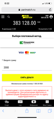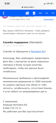 Добрый день. Являюсь игроком бк париматч, номер счета 9644351. Букмекерские заблокировал вывод средств, объясняя, что необходимо пройти повторную идентификацию, которая идет уже длительное время, так как либо не нравится фотография, либо оно не соответствующего качества. Прошу разобраться в сложившейся ситуации и помочь мне вывести мои честно заработанные деньги.