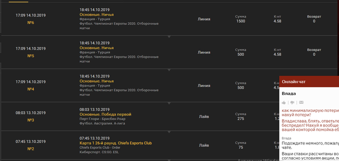 Просто так по решению администрации решили обнулить мою ставку на ничью в матче Франция, понятно. Не БК, а помойка. Не ведитесь на бонус и не регистрируйтесь здесь НИКОГДА. Его не выведут. Вы совершили ставку на бонус. К сожалению, на Вашем логине бонус был отменен по решению БК в соответствии с правилами на бонус: Букмекерская контора оставляет за собой право изменять условия,приостанавливать или отменять данную акцию в любое время у любого лица, без какого-либо предварительного уведомления и объяснения причин. При этом все сделанные ставки остаются в силе и рассчитываются согласно настоящим Правилам. Подобные ограничения будут применяться только к тем участникам, которые используют акцию в качестве источника дохода, минимизируя потери при осуществлении ставок, или осуществляя какие-либо мошеннические действия на логине.