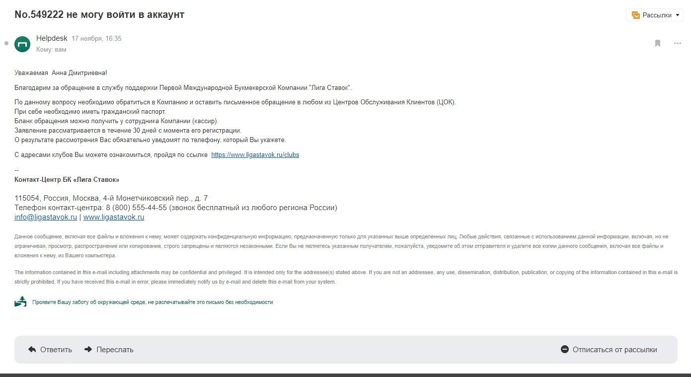 Первый депозит 20000р. поставила две ставки и фрибет,фрибет выйграл и так же одна ставка выиграла,другая нет.После этого мне не дают войти в аккаунт ссылаясь,что они нашли расхождение в документах.Я ходила в их личный клуб,заявление всё сделала,как они и сказали с паспортом."Через полчаса сможете войти". Но я так и не могу. Остаток на балансе был примерно 17000.Не помню точно,так как давно не входила в аккаунт.Помогите решить проблему!