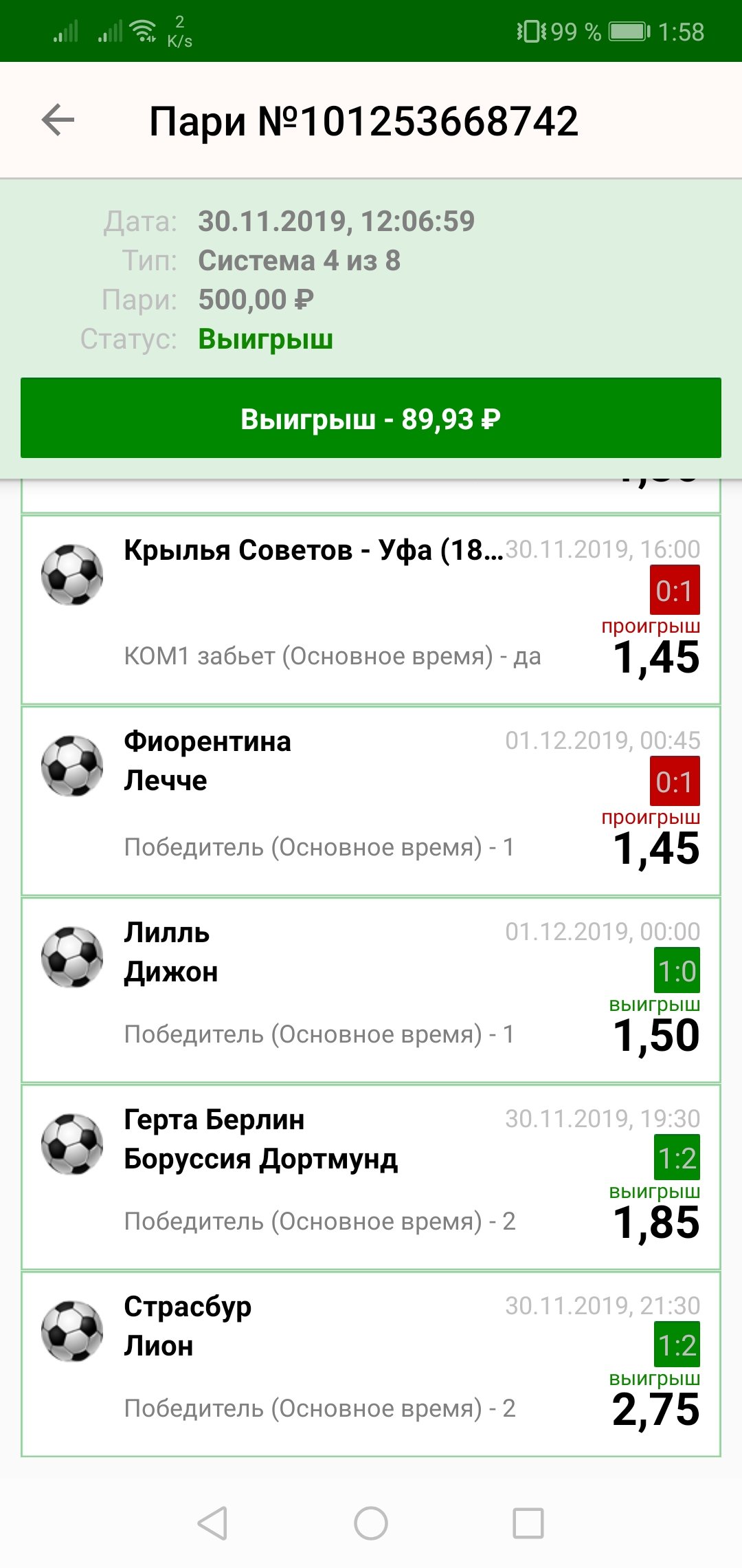 30 ноября поставил ставку в системе 4 из 8 игры, ставка прошла. Ставил для пробы 500 рублей, в итоге выигрыш составил 89 рублей. Это как понимать? Прошу разобраться, номер пари 101253668742
