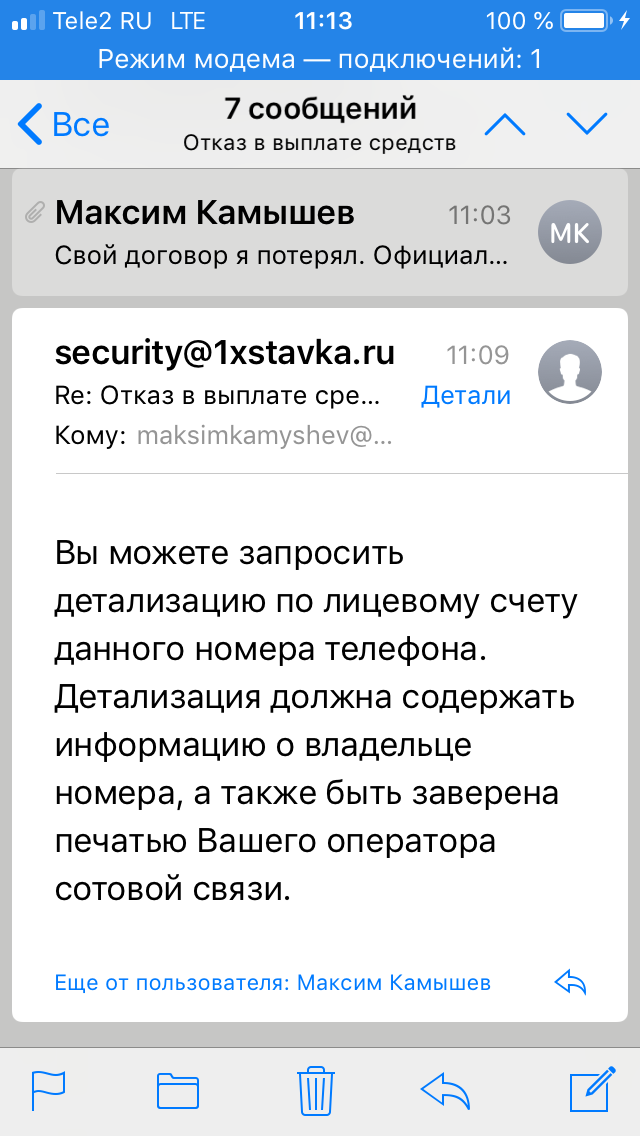 Ответ букмекерской конторы на официальный ответ сотового оператора. Считаю запрос личной информации неправомерной со стороны букмекерской конторы