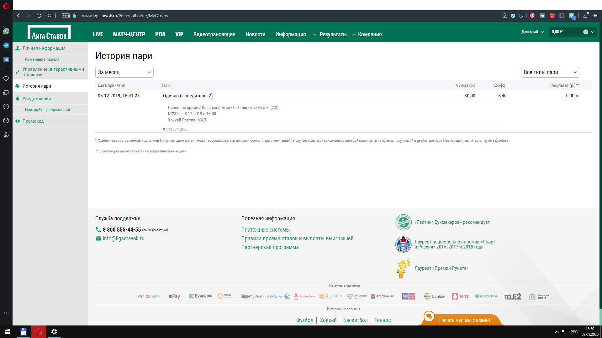 Мы заметили, что Вы используете браузер Opera, это может сказываться на корректность работы нашего сайта. Просьба авторизоваться через браузер Google Chrome и в разделе «История пари» выставить фильтр отображения пари «За три месяца». Так же историю пари можно проверить на других сервисах Компании, например мобильная версия, перейти на неё можно по ссылке https://m.ligastavok.ru/ .