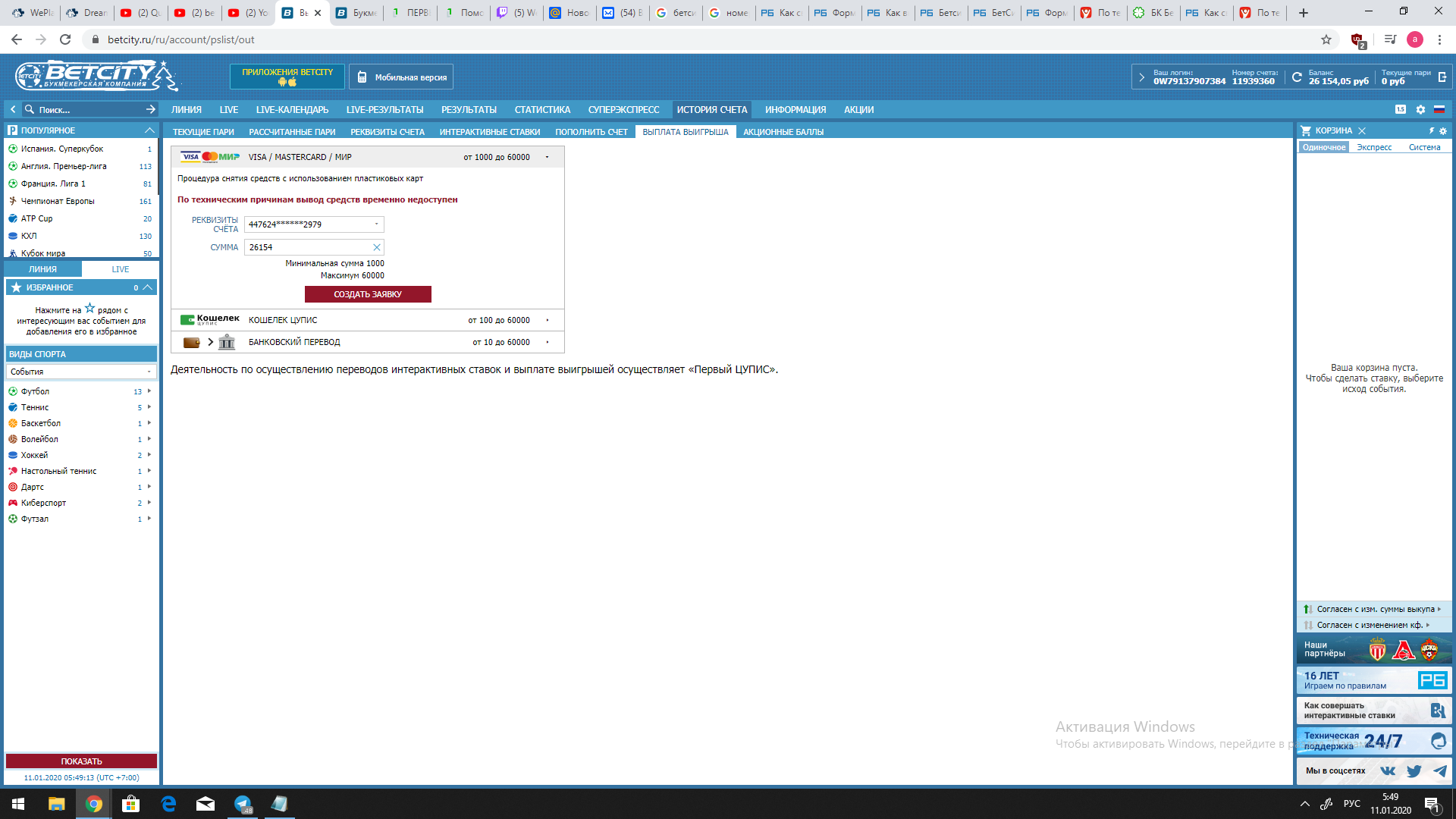 Здравствуйте. Месяца 2 назад зарегистрировался в бк бетсити. Ставил в минус,.Но сегодня поймал серию побед из 10 подряд на Киберспорт, после этого мне порезали весь киберспорт до 0р , да еще и вывод средств «По техническим причинам вывод средств временно недоступно».По какой причине не говорят. На сообщения не отвечают. Как быть в данной ситуации?Готов предоставить все скриншоты.Я честный игрок,логин оформлен на меня,могу предоставить все документы.Мой Логин 0W79137907384.Номер счета 11939360.