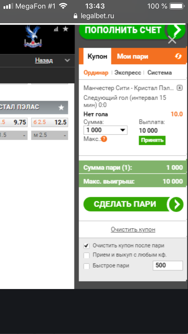 Ставка рассчитана корректно. См. линию (скрин от Alsen). Размещая ставку, игрок имеет возможность видеть, на что сделана ставка - "нет гола". Во всех 15-минутных интервалах. В выбираемом интервале отображаются иные котировки. При этом непосредственно в купоне отображение рынка некорректно. Арбитраж Легалбет будет рекомендовать БК внести изменения в информацию купона.