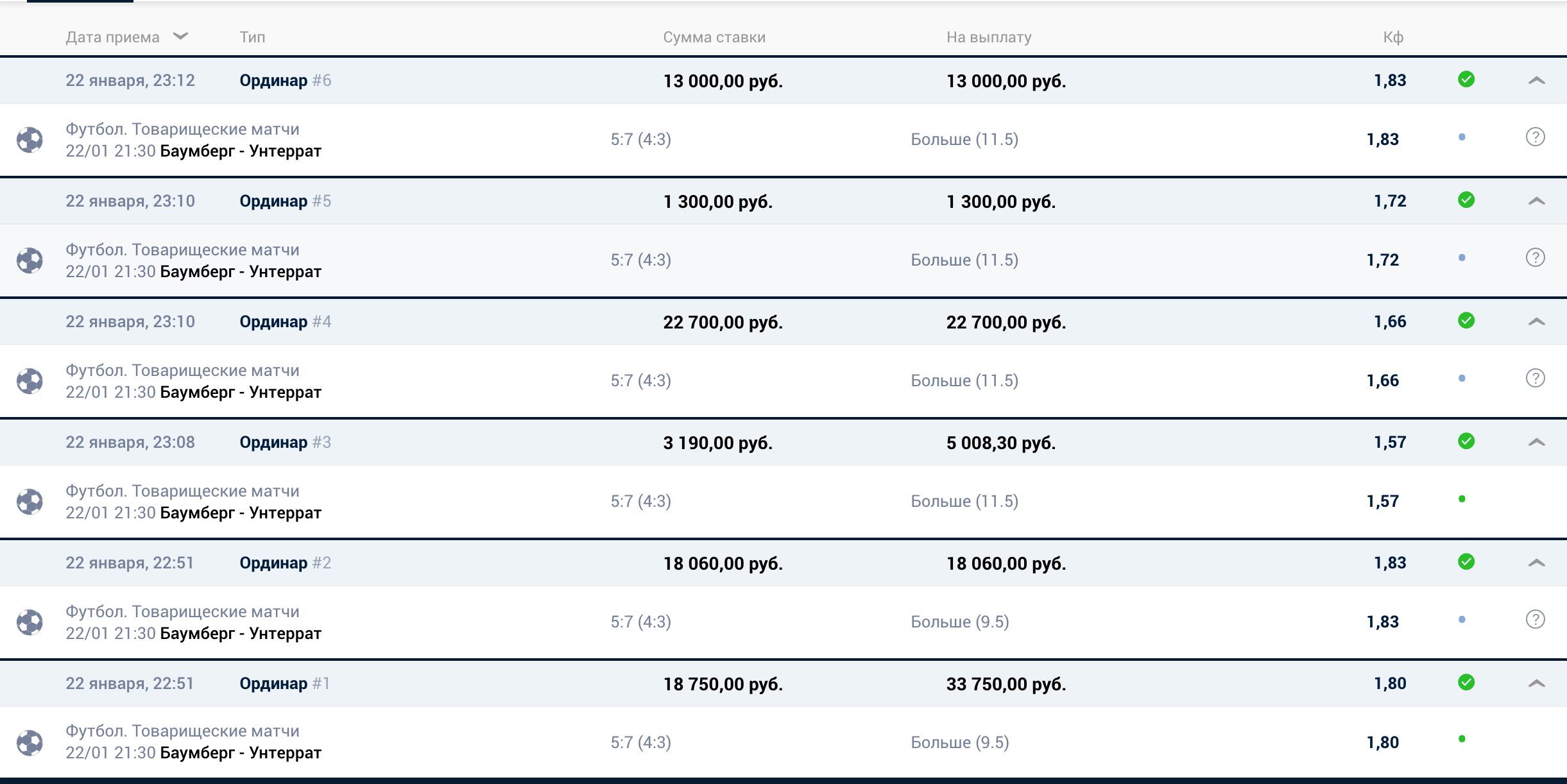 Однако счет мы нашли, на счету есть ставки выигрышные на один и тот же исход. И все ставки в пределах лимита на исход.