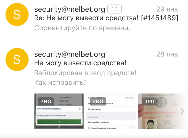 мой лицевой счет в мелбет 76339013 28.01.20г. я внес на свой депозит 50 000р. сделал ставку на событие которое проанализировал, начислен выигрыш, при попытки вывести средства, появилась критическая ошибка, что счет заблокирован! обратился в техническую поддержку, сообщили что необходимо предоставить документы удостоверяющие личность. как только я сделал все что меня просили, мне заблокировали аккаунт и предложили обжаловать блокировку, я обжаловал, на что мне ответили, что я получу подтверждение о РЕГИСТРАЦИИ моей жалобы в течении 72часов! Такое ощущение, что даже отвечать не собираются, сутки уже прошли! Запросил у оператора мелбета номер лицензии, для обращение в СРО, на что мне предложили посмотреть в разделе о нас! там нет никакой лицензии! ЕСТЬ ВСЕ СКРИНЫ И ВСЕ ПОДТВЕРЖДЕНИЯ МОИХ СЛОВ!!!