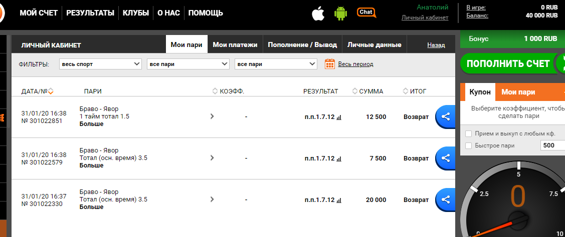 Сделал несколько ставок на товарищеский матч Браво - Явор, номера купонов: 301022579 - 2,09 301022330 - 2,09 301022851 - 2,01 ( сделали возврат, после того как ставка прошла. (между принятием и возвратом более 30 мин) Согласно п.п. из-за некорректных коэффициентов в момент принятие пари расчет произведен с кф.1. К сожалению, в момент формирования коэффициентов произошел технический сбой, из-за чего коэффициент был сформирован некорректно, в таких случаях компания оставляет за собой право рассчитывать подобные ставки с коэффицентом 1. Так вот, никакого технического сбоя не было, КФ не отичается от рыночного. В этот же момент на фонбете (на 16:38:15, купон № 301022851 (на вин) - . Бинго бум . Или если у них это не рыночный и можно возвратом считать Матч еще идет, как сыграют оставшиеся 2 купона, я не знаю, в любом случае. считаю действия бк нечестными по отношению ко мне. Неважно сыграет ставка, или не сыграет, пусть рассчитывают по "своему рыночному" кф, а не с кф 1