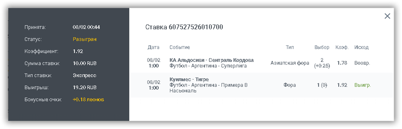 Ставка 607527526010700 Дата Событие Тип Выбор Коэф. Исход 08/02 1:00 КА Альдосиви - Сентраль Кордова Футбол - Аргентина - Суперлига Азиатская фора 2 (+) Возвр. 08/02 1:00 Куилмес - Тигре Футбол - Аргентина - Примера B Насьональ Фора 1 (0) Выигр. Матч КА Альдосиви - Сентраль Кордова ,итоговый счет 0 - 2 ставка заиграна,оформили возврат,якобы произошел сбой,матч попсовый со статистикой на аля myscore и прочих баз данных по фут матчам. Прошу разобраться легалбет