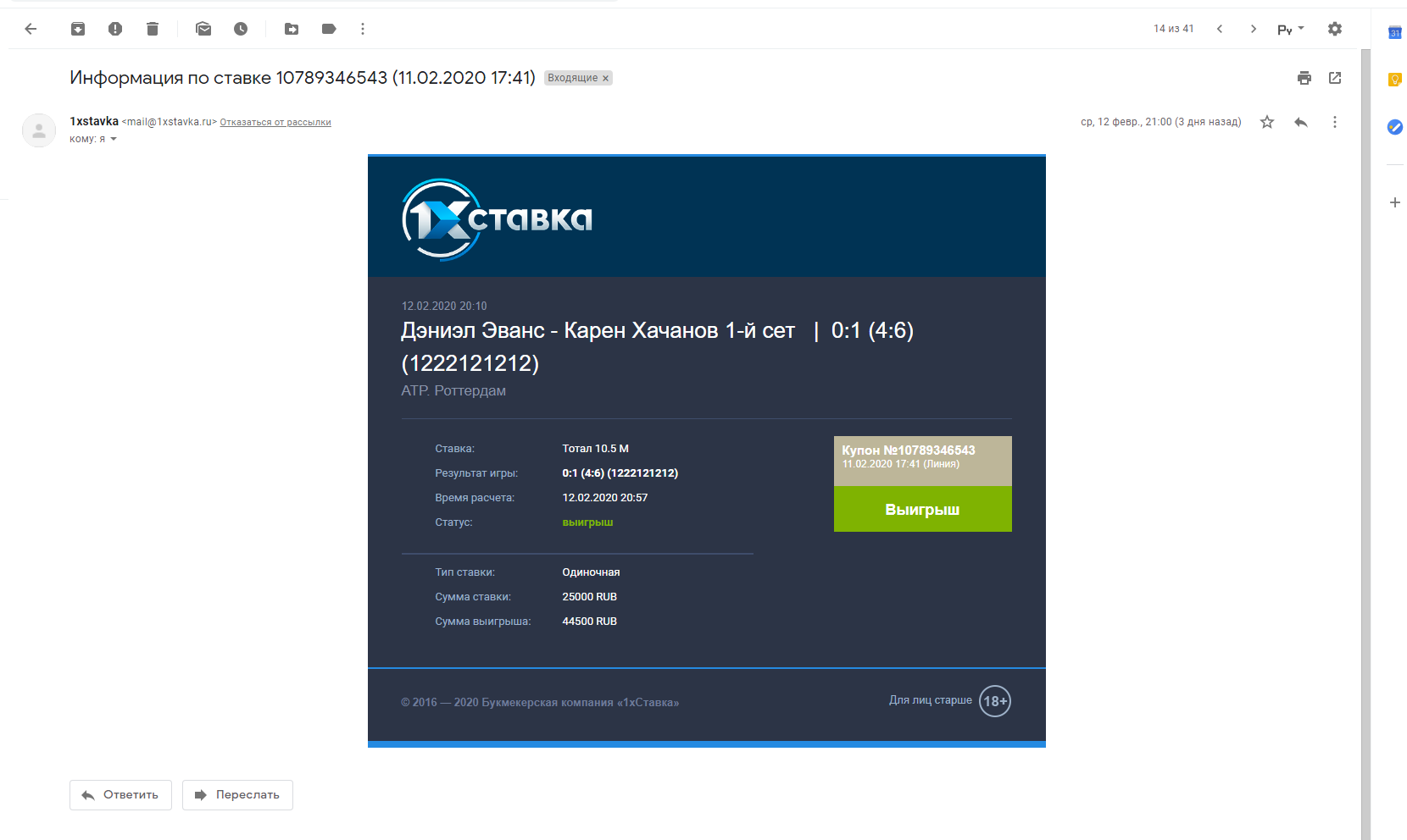 Здравствуйте. Букмекер принял наши аргументы, по вашей жалобе положительное решение. Ставки пересчитаны по исходному коэффициенту.Подтвердите, пожалуйста, зачисление выигрыша.