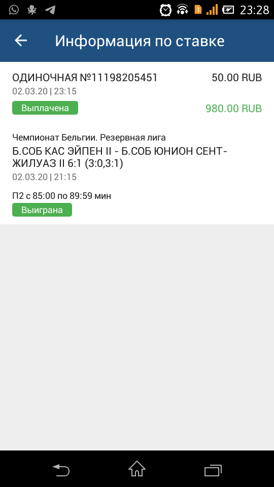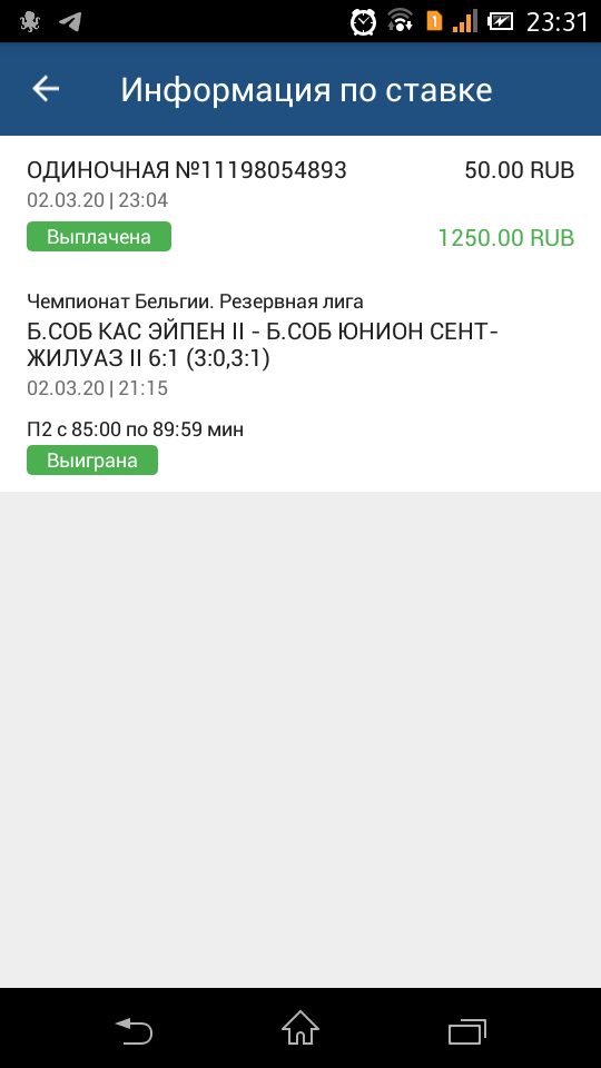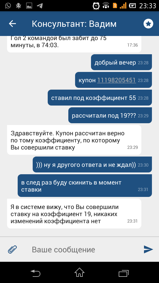 собственно, как это модно говорить, сабж в топике))) купон 11198205451 в тот момент когда я нажимал быстрой ставкой на Б,СОБ П2 85-90, коэффициент был указан 55. Если честно, утверждать не буду, но я думаю я заметил бы сразу если бы он стал 19,8 после того как"прокрутилось" и ставка принялась, т.к. окно не закрывал. Буквально через минуту зашел проверить коэффициент в матче, он был вообще 65 уже. Может ли коэффициент так скакать? И может ли коэффициент "проскользнуть" с 55 до 19,8 в момент быстрой ставки, при отсутствии в игре удалений/пенальти и прочего? Вообщем, откровенно говоря, думал слово проскальзывание осталось в страшном форексовском прошлом, но оно настигло и тут)) Чтов этой ситуации можно/нельзя сделать? Я понимаю и принимаю как должное проскальзывания на интервалах с 25 до 20, вообщем в пределах 10 пунктов. Но с 55 до 19,8 это уже совсем наглость. ps. Если бы у меня был скринщот в моментпринятия ставки где был бы виден коэффициент, это что нибудь изменило?)