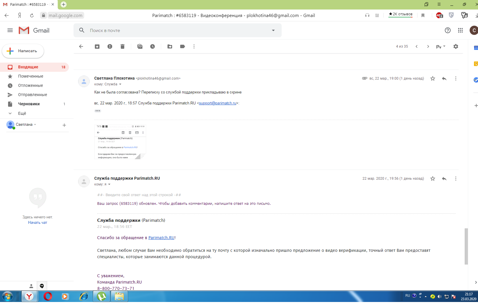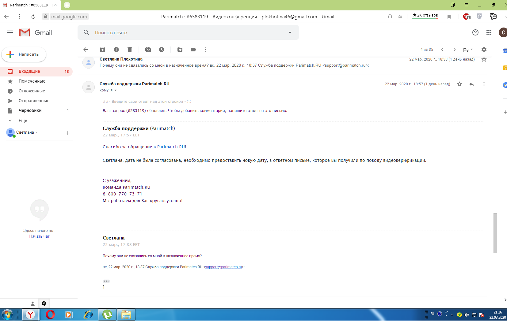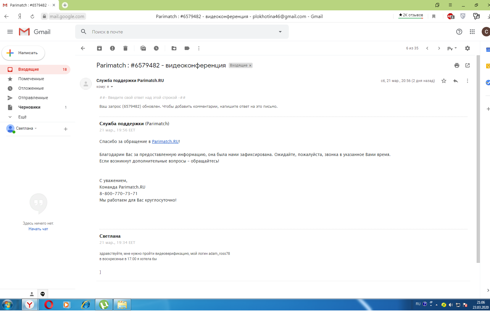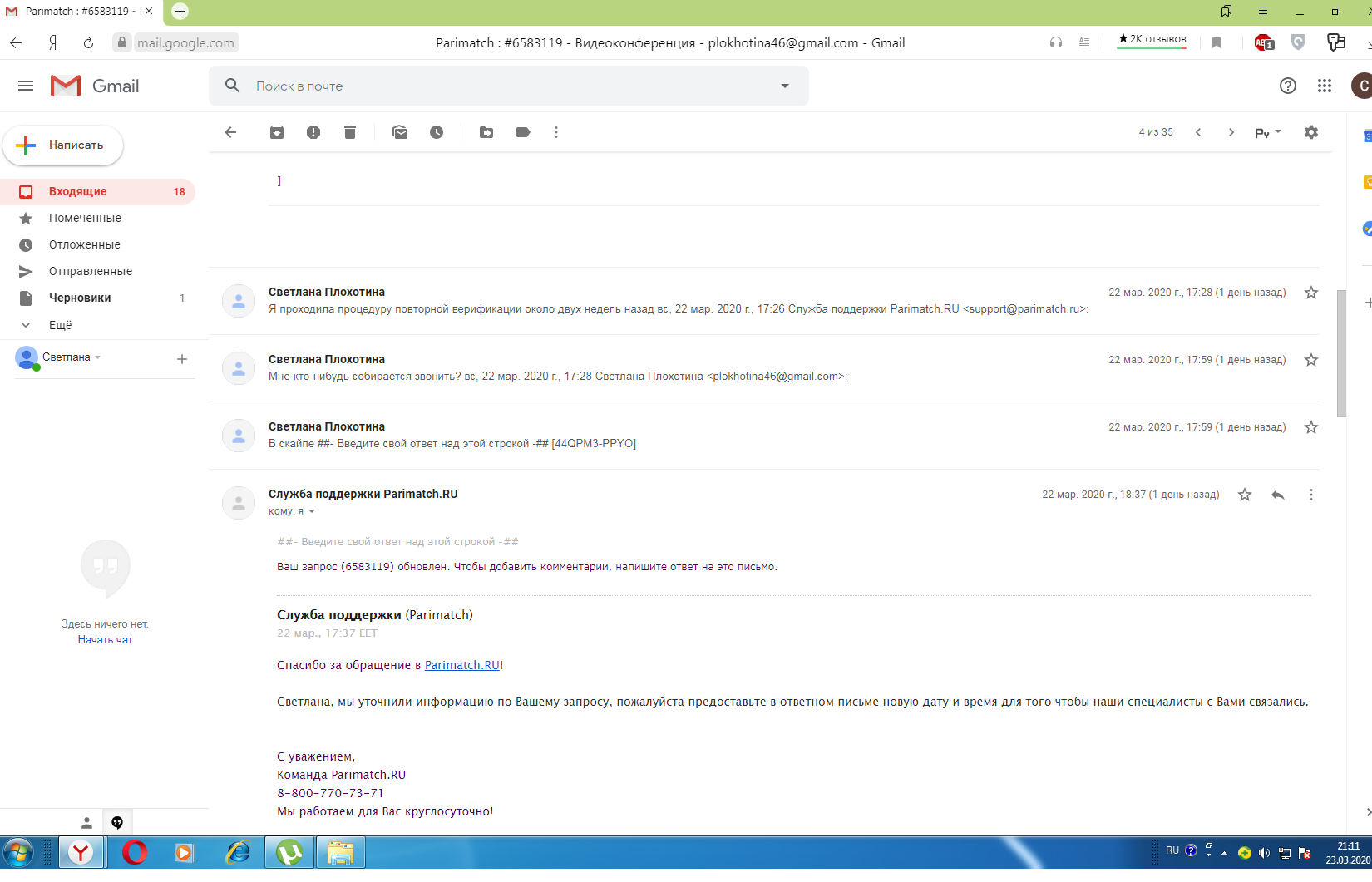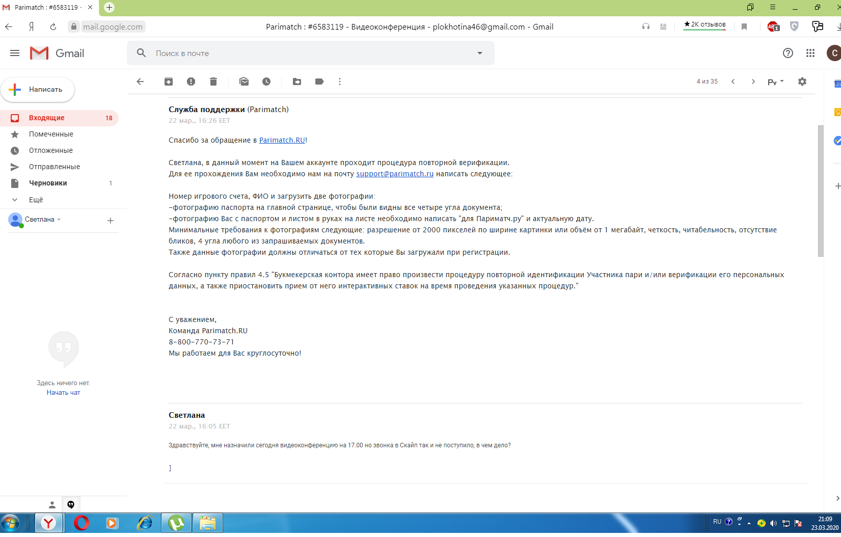 Около недели назад я хотела вывести деньги из бк, но у меня выскочило сообщение вывод недоступен, обратитесь в службу поддержки. Я написала, где мне ответили, что нужно предоставить фото с паспортом и бумажкой м надписью париматч и текущей датой, я все отправила, потом начали опять запрашивать фото с паспортом и пропиской, фото комунальных услуг, тоже все отправила, потом мне позвонила девушка и сказала, что требуется дополнительная верификация и подробности отправлены на почту, туда пришло сообщение, что нужна еще видеоверификация, я написала в ответ просьбу о назначении времени, а в ответ тишина, написала отдельное письмо, тоже никакого ответа! Может быть вы мне подскажите, что это за издевательство и сколько они еще поводов найдут, чтобы не выплатить мне мои деньги!!! Скриншоты писем прикладываю